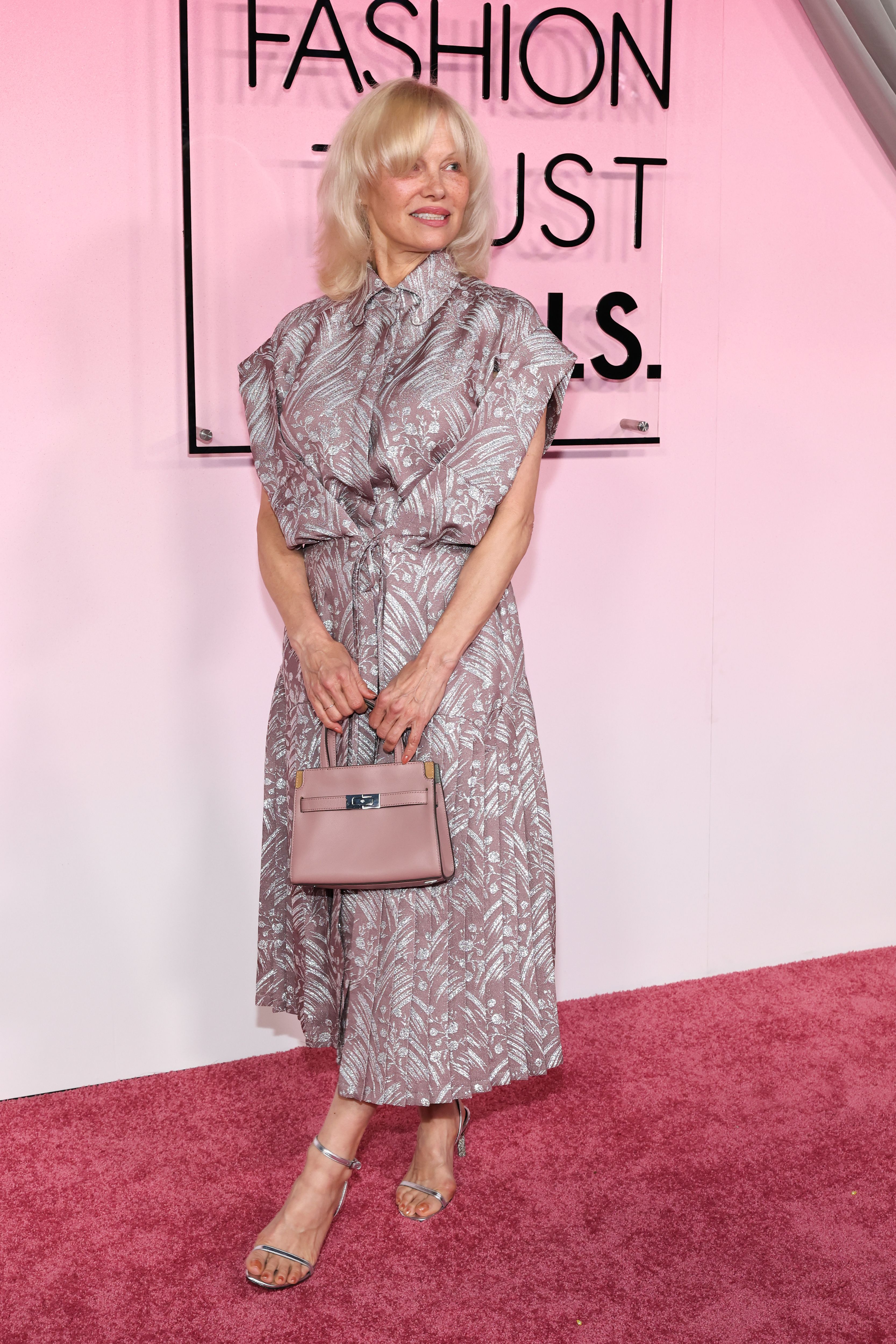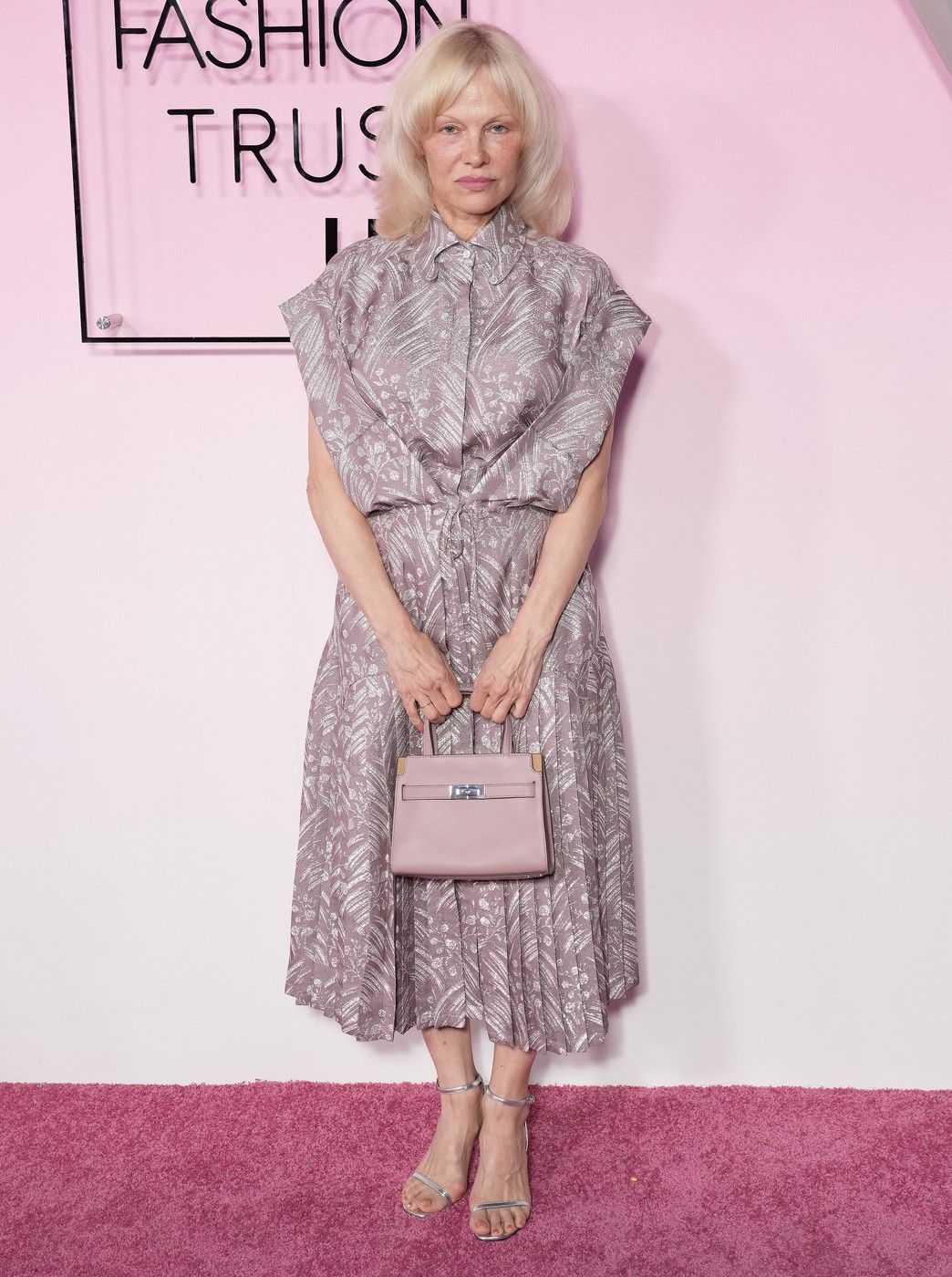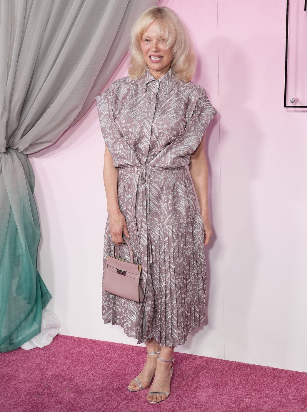 Pentru eveniment, Pamela a purtat o rochie în nuanță de mov pal, cu imprimeu floral argintiu, completată de un detaliu elegant în față și mâneci ample. Ținuta a fost accesorizată cu o geantă mini Hermès Birkin, într-o nuanță delicată de roz.