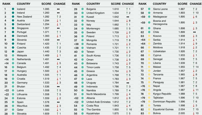 Micul stat insular este urmat de Irlanda (1.260 puncte), care își păstrează, de asemenea, privilegiatul statut de țară extrem de sigură, în timp ce pe ultima treaptă a podiumului a urcat Noua Zeelandă (1.282, în urcare cu două poziții). Pe locul 4-5 sunt Austria și Elveția, cu punctaj identic, 1.294, ambele în coborâre cu câte o poziție.