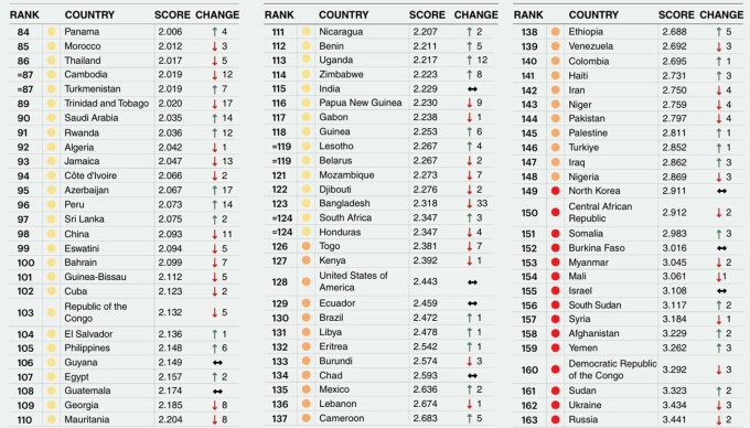 La capătul opus, cele mai periculoase țări din lume sunt Rusia (3.441), Ucraina (3.434), Sudan (3.323), Congo (3.292) și Yemen (3.262).