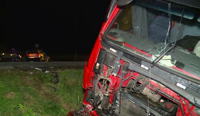 Corespondent Știrile PRO TV: „Impactul a fost atât de violent, încât partea din față a mașinii a fost aproape în totalitate distrusă, iar autotrenul s-a răsturnat în șanț”.