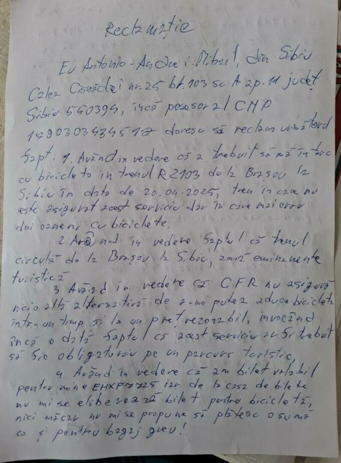 „Mi s-a propus, nici mai mult, nici mai puțin, suprataxa de 75 de lei sau să las bicicleta jos din tren ca să îmi ca să îmi continui călătoria, de către șeful de tren. Menționez că aș fi plătit acești bani, dar la momentul în care scriu mai am fix 46 de lei, bani care poate mi-ar fi ajuns dacă nu plătesc în regim de suprataxă”, a scris Antonio Andrei Mihail în reclamația pe care a înregistrat-o imediat după ce a fost dat jos din tren, în halta Brădet.