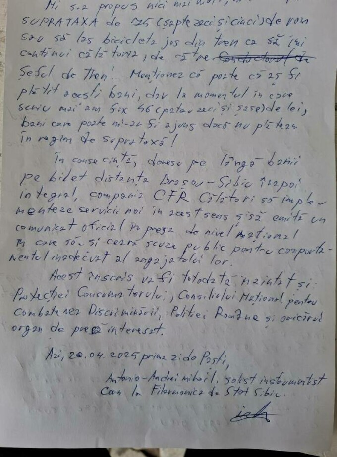 Acest înscris va fi totodată înaintat și Protecției Consumatorului, Consiliului Național pentru Combaterea Discriminării, Poliției Române și oricărui organ de presă interesat”, a mai scris Antonio Andrei Mihail în reclamația înregistrată în atenția conducerii CFR la halta de mișcare Brădet pe 20 aprilie 2025.