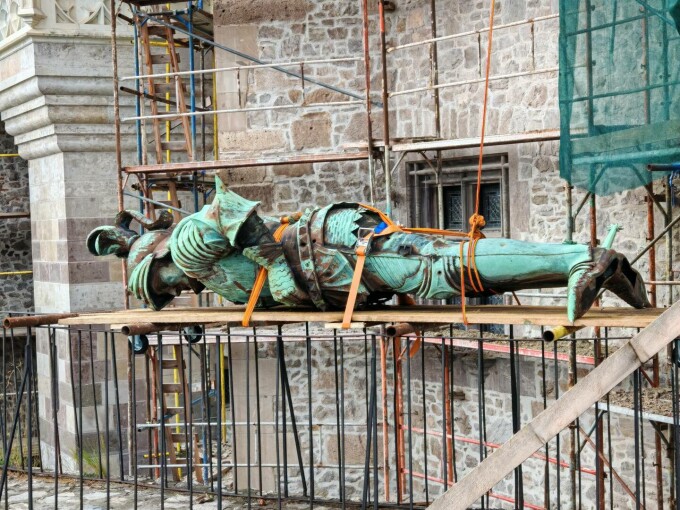 „Cavalerul în armură”, statuia care îl reprezintă pe Ioan (Iancu) de Hunedoara amplasată pe Turnul Buzdugan al Castelului Corvinilor a fost astăzi demontată de pe suport şi coborâtă la sol, pentru prima dată după 152 de ani.