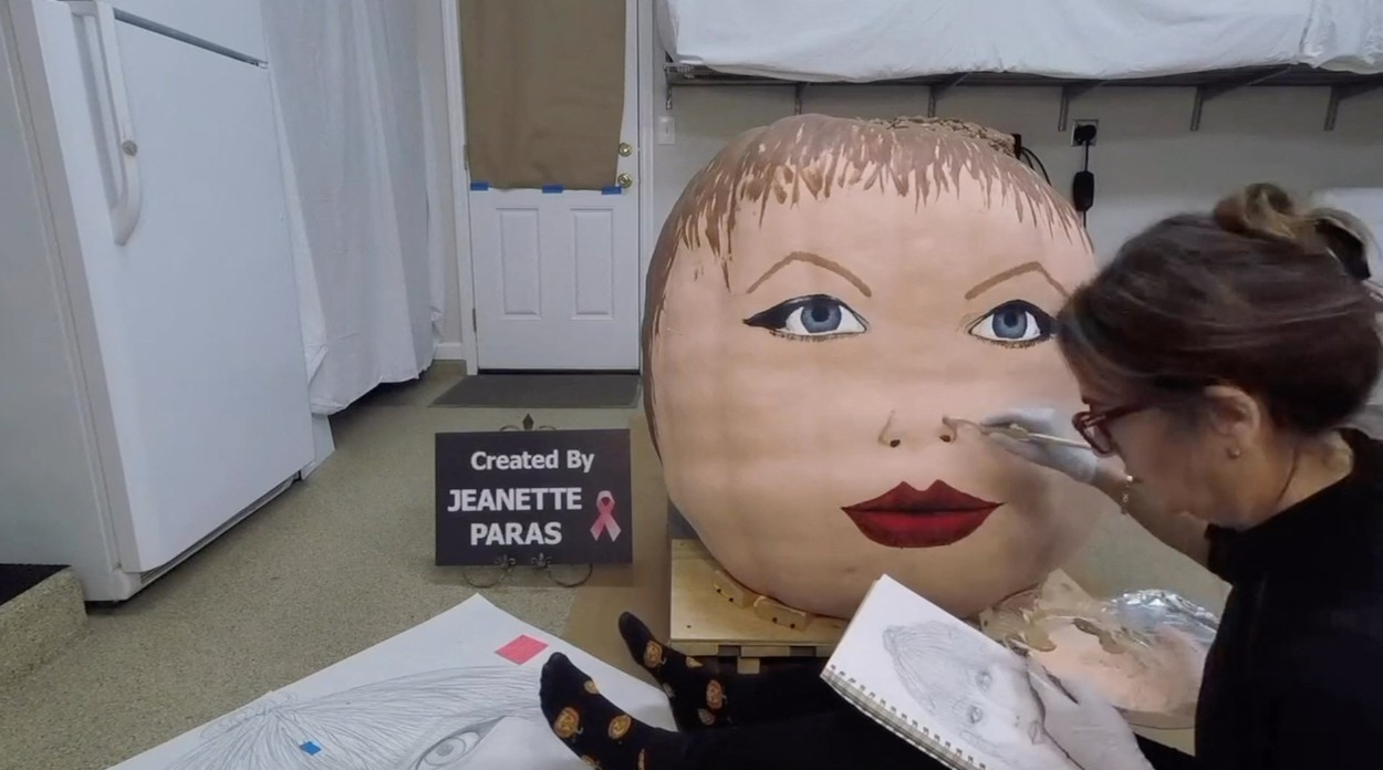 Jeanette Paras, în vârstă de 68 de ani, pictează dovleci uriaș care au devenit celebri încă din 1988, conform site-ului său.