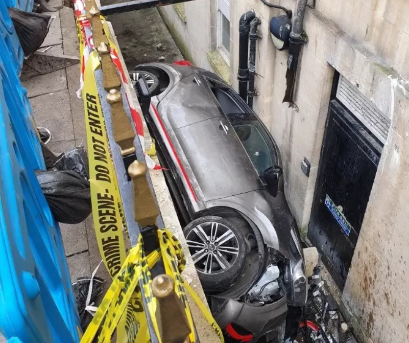 Un accident grav a avut loc, duminică, în orașul britanic Bath. Un șofer a pierdut controlul volanului, a intrat cu mașina într-un hotel și a căzut în lateral pe o alee de la subsol, care desparte un hotel de trotuar.