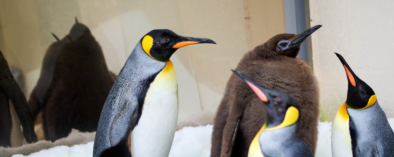Pesto îşi va pierde în curând puful pentru a-şi dobândi penele de adult, pata galbenă caracteristică pe cap şi aspectul ce evocă un frac negru şi alb al pinguinilor imperiali din Antarctica.