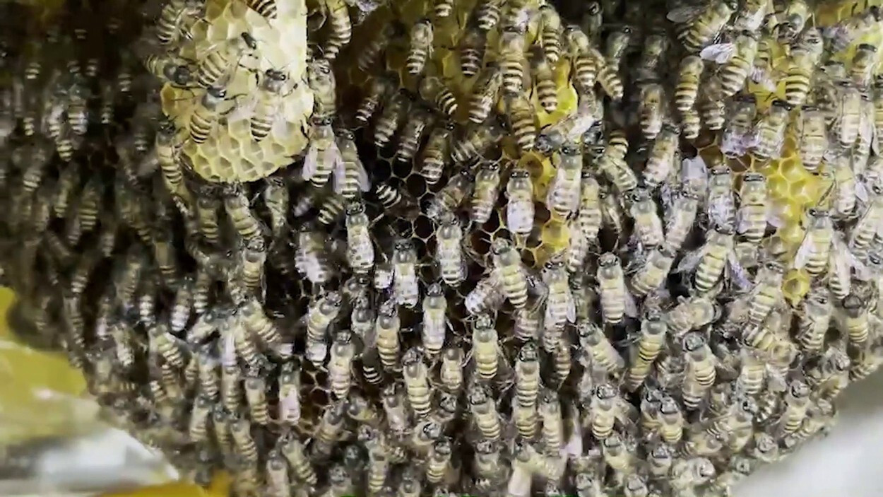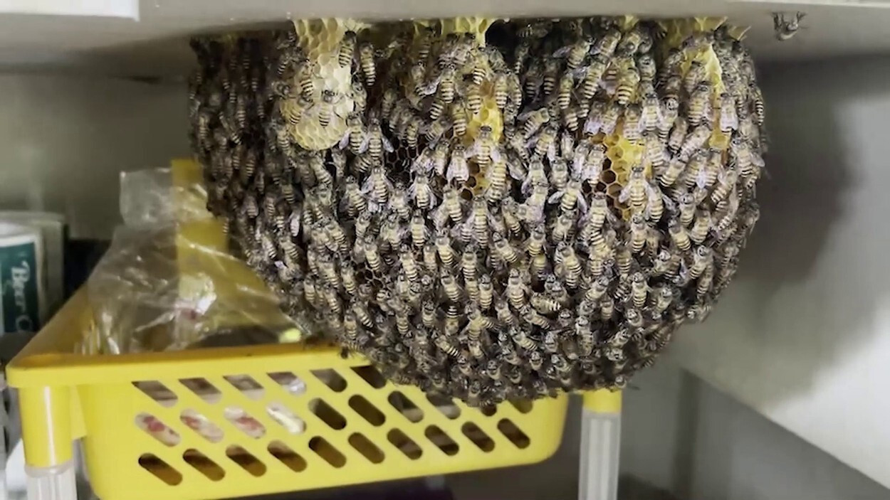 Albinele au intrat în dulapul cu vase și au construit totul înainte ca angajații restaurantului să își dea seama. Ei au descoperit abia când stupul a devenit de dimensiunea unui pepene verde.