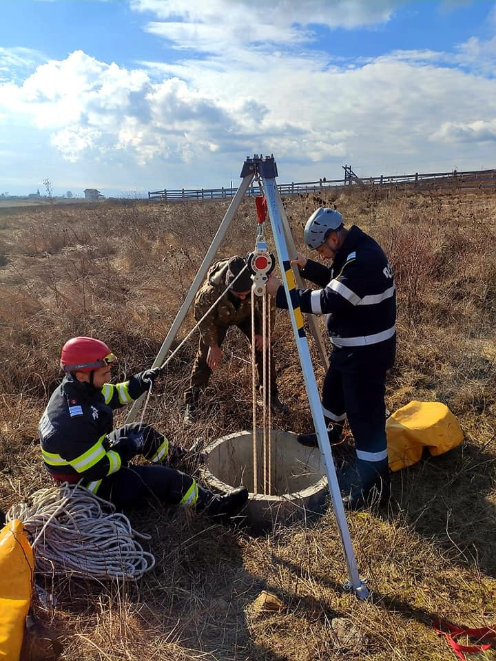 Un căţel care a căzut într-un puţ adânc de 12 metri a fost salvat, joi, de un echipaj al pompierilor din Deva, unul dintre militari coborând în fântână şi reuşind să scoată la suprafaţă animalul.