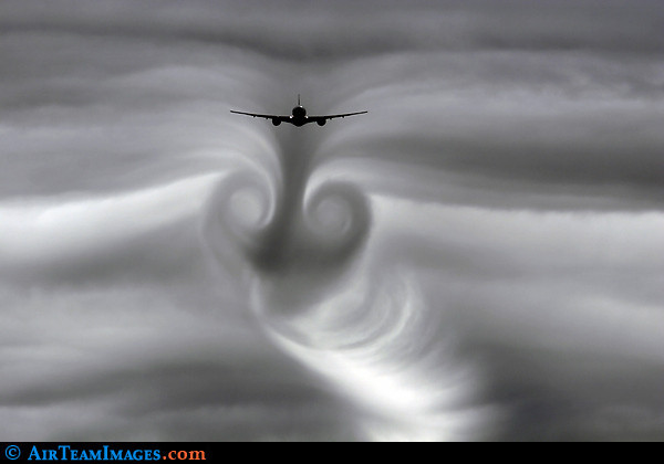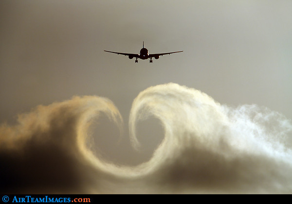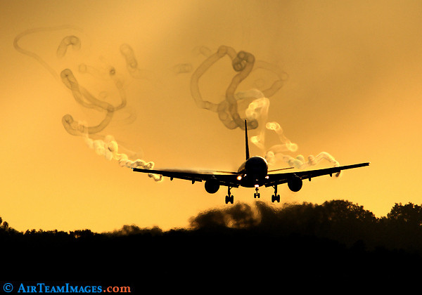 Amurg: Vârtejurile formate de aeronave pot avea modele neregulate, aşa cum se poate observa şi din următoarea imagine surprinsă în timpul unui apus de soare