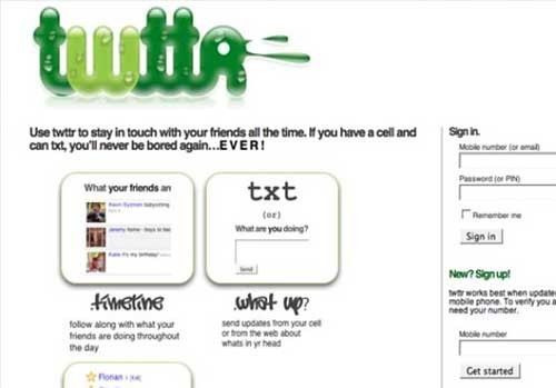 Pagina Twitter avea, in 2005, un fundal alb si sigla verde, complet diferite de aspectul din prezent, cu albastru si emblema cu pasare. La lansare, numele site-ului era scris "Twttr", iar motto-ul paginii era "Daca ai un telefon mobil si poti scrie mesaje, nu te vei mai plictisi niciodata".