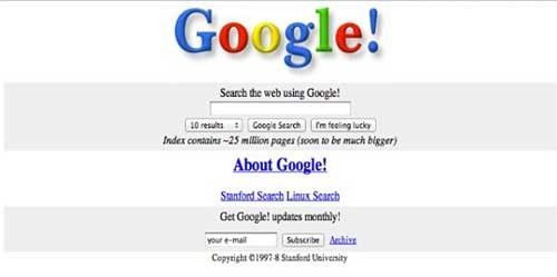In 1998, sigla Google era urmata de un semn de exclamare, iar site-ul oferea doar optiunea de cautare a termenilor. Google indexa 25 de milioane de pagini, in timp ce in prezent indexeaza 25 de miliarde, scriedailymail.co.uk.