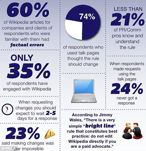 Cercetarea a fost condusa de Public Relations Journal, care a chestionat 1284 de membri despre articolele clientilor lor pe Wikipedia.