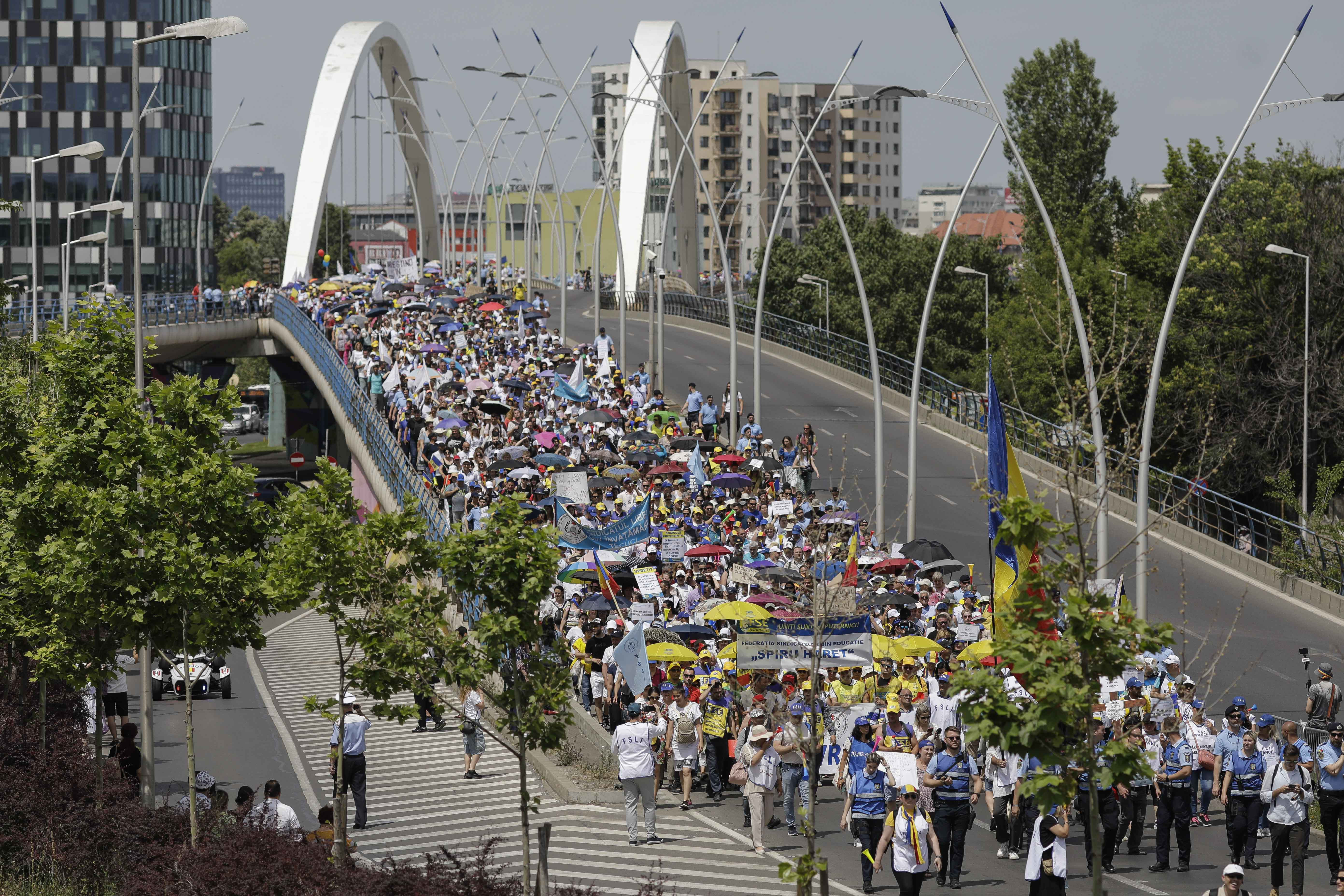 Sindicaliştii din Educaţie protestează din nou, vineri, la Bucureşti. Protestatarii s-au strâns în Piaţa Victoriei, urmând să plece în marş pe străzile Capitalei.
