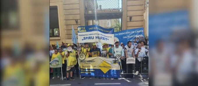 Sindicaliştii din învăţământ protestează, marți, din nou, în fața sediului Ministerului Educaţiei şi Cercetării, nemulţumiţi de măsurile adoptate de Guvern care fac referire la reducerea deficitului bugetar.