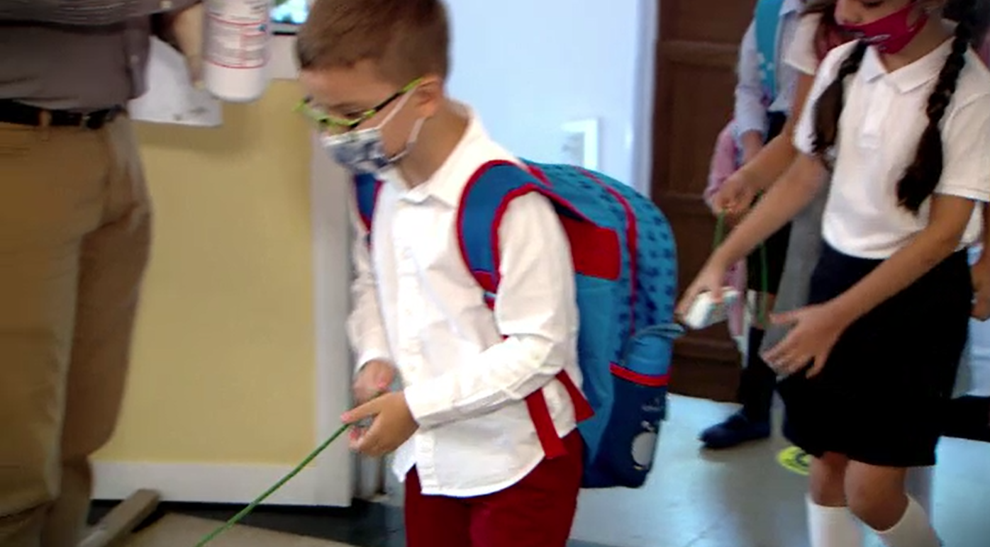 Dascălii le-au dat copiilor să ţină fiecare o bucată de sfoară la un metru distanţă unul faţă de celălalt spre intrarea în sala de clasă. În şir indian, şi-au luat la revedere de la părinţi şi bunici şi au făcut primul pas mare în viaţă.
