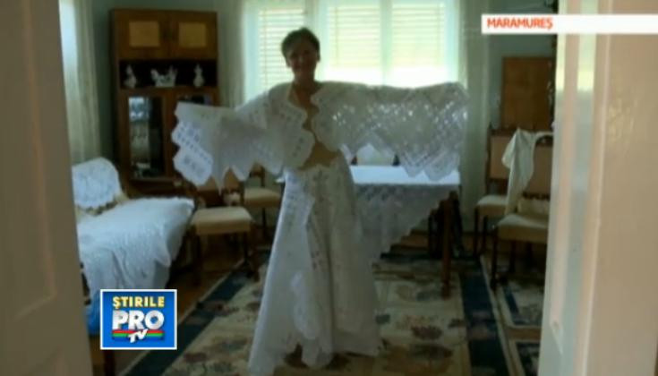 Mireasa colectiei a fost imbracata cu fetele de masa Reghina Ditiu, din Valenii Socutei, Maramures.