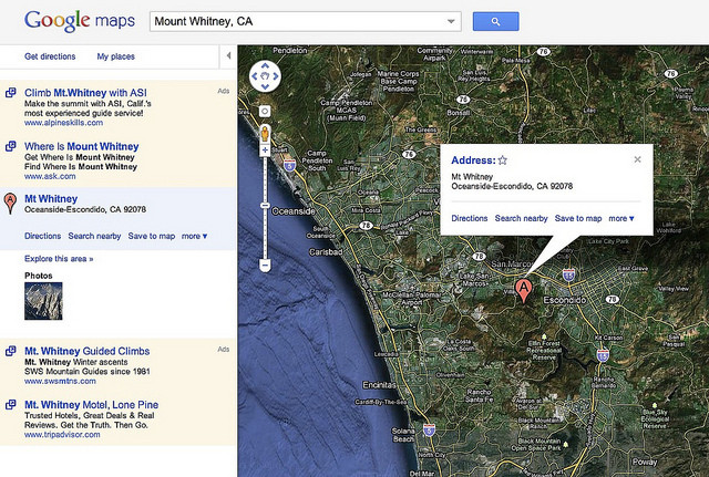 Muntele Whitney este cel mai inalt dintre toti muntii din SUA continentala. E normal sa fie usor de fixat pe harta, mai ales pentru cineva care cu asta se ocupa, cum ar fi Google Maps.