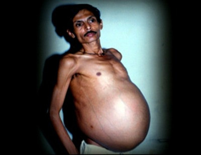 2. Fetus in Fetu (foto 2) - Barbatul din imaginea alaturata este Sanju Bhagat, in varsta de 36 de ani, din India. In 2006, indianul, chinuit de dureri abdominale, a mers la doctor si a aflat ca nu are o tumora in abdomen, ci fragmente (picioare, maini, unghii si par) din corpul fratelui sau geaman, dezvoltat anormal in trupul sau. Fenomenul, care in termeni medicali poarta denumirea de "fetus in fetu", este extrem de rar (au fost inregistrate mai putin de o suta de cazuri in intreaga lume) si poate aparea o data la 500.000 de sarcini.