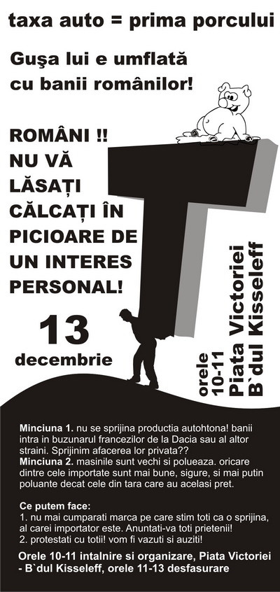 "Sambata 13 Decembrie , ora 10, Piata Victoriei, se anunta MARE MANIFESTATIE impotriva taxei auto , impotriva HOTILOR care ne obliga la credite pt a ne cumpara MASINI NOI vandute de ei! Stam si ne uitam cum ne FURA LEGAL !!! Prezenta TA demonstreaza ca iti pasa de BANII tai. DA MAI DEPARTE! MACAR ATAT POTI SA FACI !!!"
