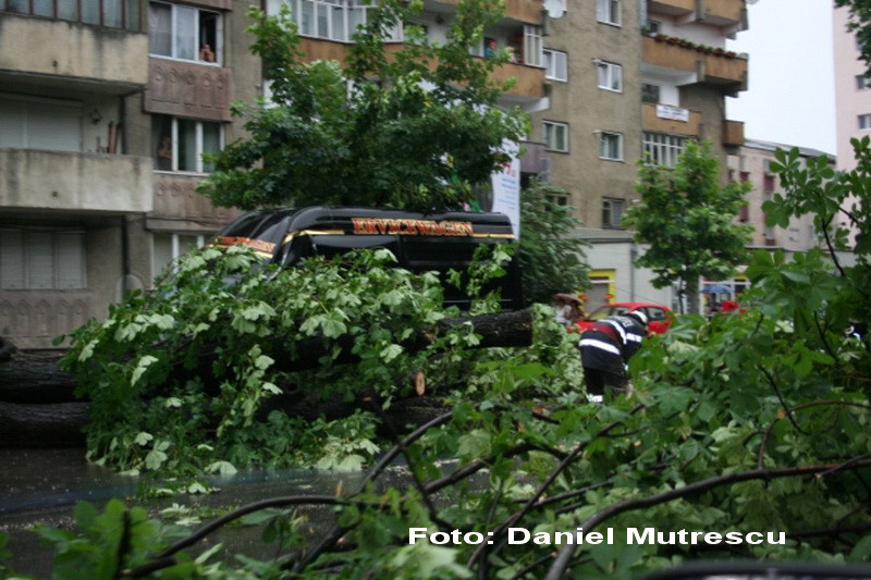 Copacii care au cazut la furtuna din Bistrita de miercuri au distrus mai multe masini, in timp ce vantul puternic a smuls acoperisurile de pe case si blocuri.