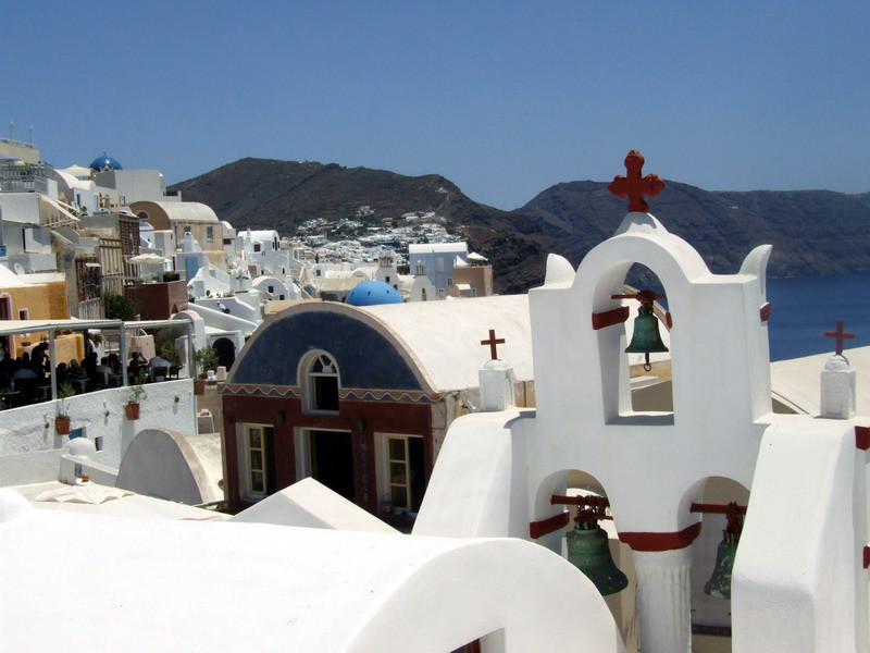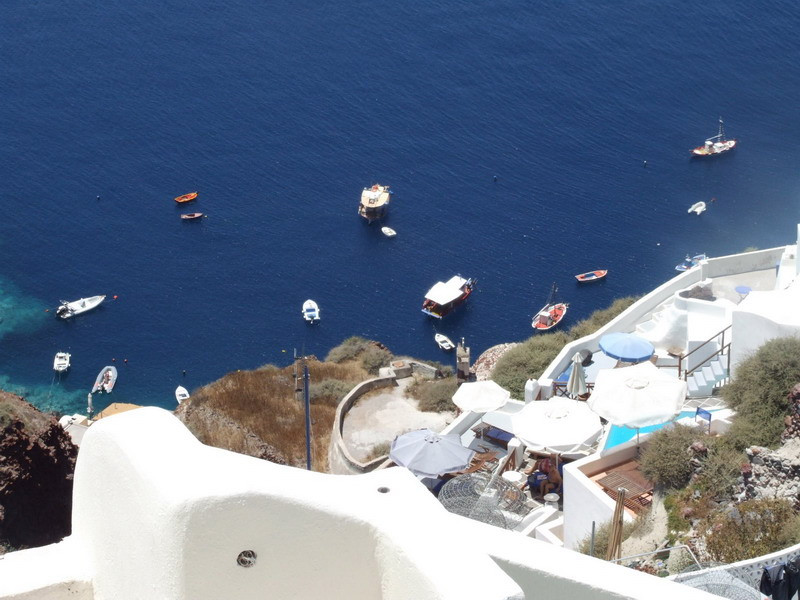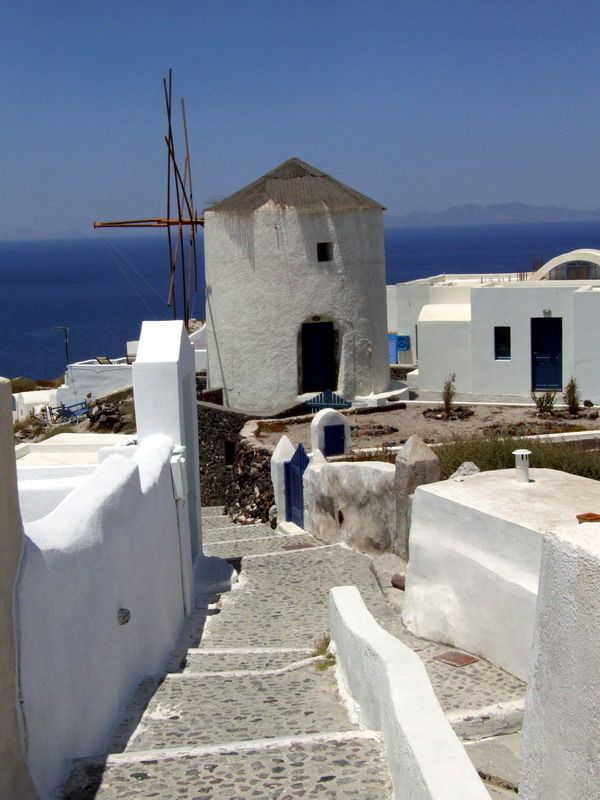 Cobori de pe vas in capitala Fira. Punctul de atractie este, insa, de departe, Oia, un orasel-capodopera. Casute simetrice, alb cu albastru, strazi inguste de un metru si jumatate, case impodobite cu bougainvillea, miros de fistic tras in caramel si de Vinsanto, o "specialitate a casei", un vin rosu tinut in butoaie de stejar pentru cel putin 5 ani. Pentru cunoscatori, seamana foarte mult la gust cu Chianti-ul de desert si cu Lacrima lui Ovidiu, productie autohtona, de Murfatlar. Costa cam 20 de euro o sticla mica.