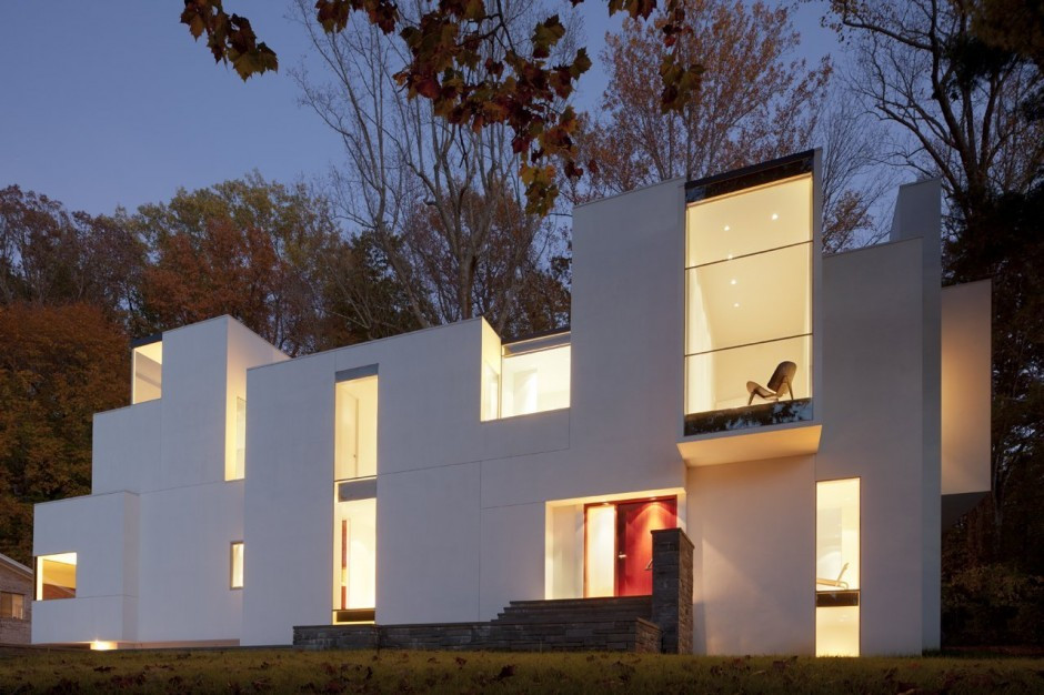 Doar linii drepte, colturi de 90, multe cuburi, o singura culoare, volume aparent aranjate haotic, auster, dar se pare ca exista.