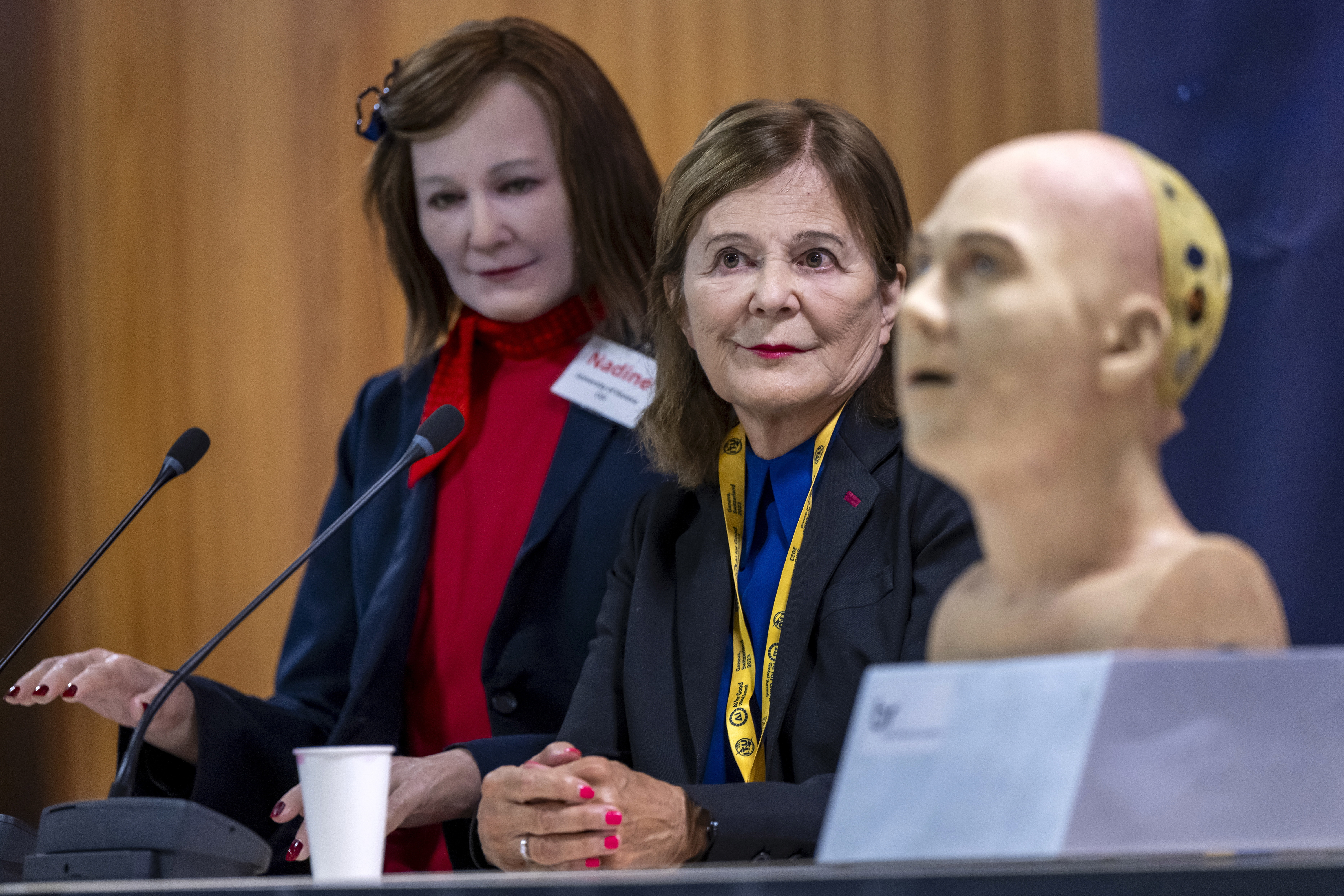 "Câtă tensiune există în această tăcere", a declarat unul dintre roboţi în debutul conferinţei de presă, care s-a ţinut doar în limba engleză.