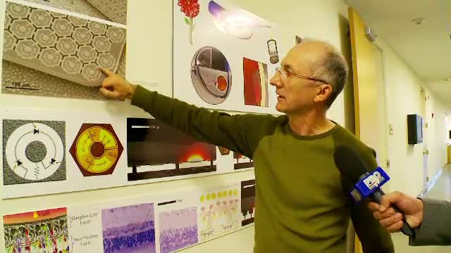 Ludwig Galambos: "Dupa ce am facut diodele, le testam aici, mai departe sunt duse la facultatea de medicina sunt implamantate, sunt 5-6medici, sunt puse intr-un instrumente, face o incizie in ochi, o baga in retina si se exfoliaza. Sunt cateva sute de diode, astea sunt legate in serie, fiecare set, trebuie sa dea 1,5W si sunt activate de un laser, in fata ochiului, laser 900 nm care nu afecteaza vederea ochiului".