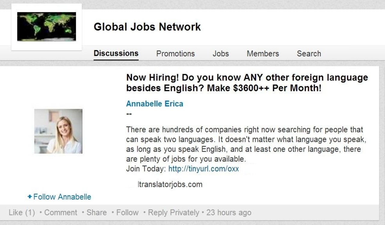 Un astfel de profil fals al unui "specialist" in recrutare - Annabella Erica - a fost promovat in numeroase grupuri de LinkedIn, precum Global Jobs Network, care include 167.000 de utilizatori la nivel global.