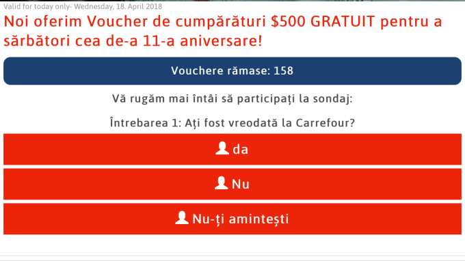 "Ideal ar fi ca, în cazul în care ceva pare suspect, să încercaţi tastarea manuală a site-ului în browser sau prin intermediul motorului de căutare pe internet (ex: Google, Bing etc.). Mai departe, utilizatorul trebuie să parcurgă un chestionar scurt, cu trei întrebări legate de experienţa de shopping la cele două hypermarketuri, pentru ca ulterior să primească un mesaj de felicitare, unul cu multe greşeli de transcriere (...) Condiţia pentru folosirea acestui voucher fictiv este partajarea informaţiei către prieteni, tot prin intermediul WhatsApp", atrag atenţia experţii.