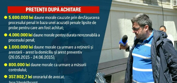 Fostul secretar de stat Marius Fecioru pretinde 5.600.000 de lei daune morale pentru că - susține el - ar fi fost judecat pentru acuzații penale lipsite de probe. Mai cere 4 milioane de lei pentru durata lungă a procesului la finalul căruia a fost achitat, la care adaugă un milion de lei pentru că a fost reținut, arestat la domiciliu și preventiv. Plus încă 800.000 de lei pentru că a fost plasat sub control judiciar și i s-a interzis să iasă din țară. Fostul demnitar pretinde să i se plătească și sumele cheltuite cu avocații, peste 350.000 de lei.