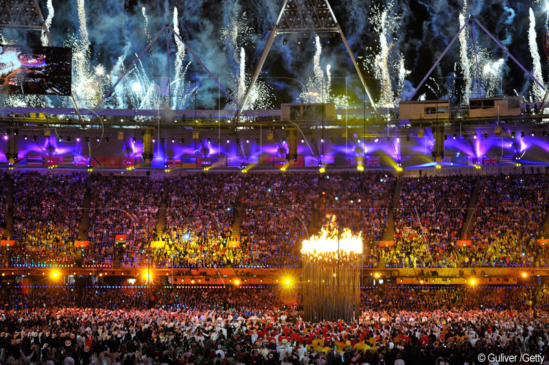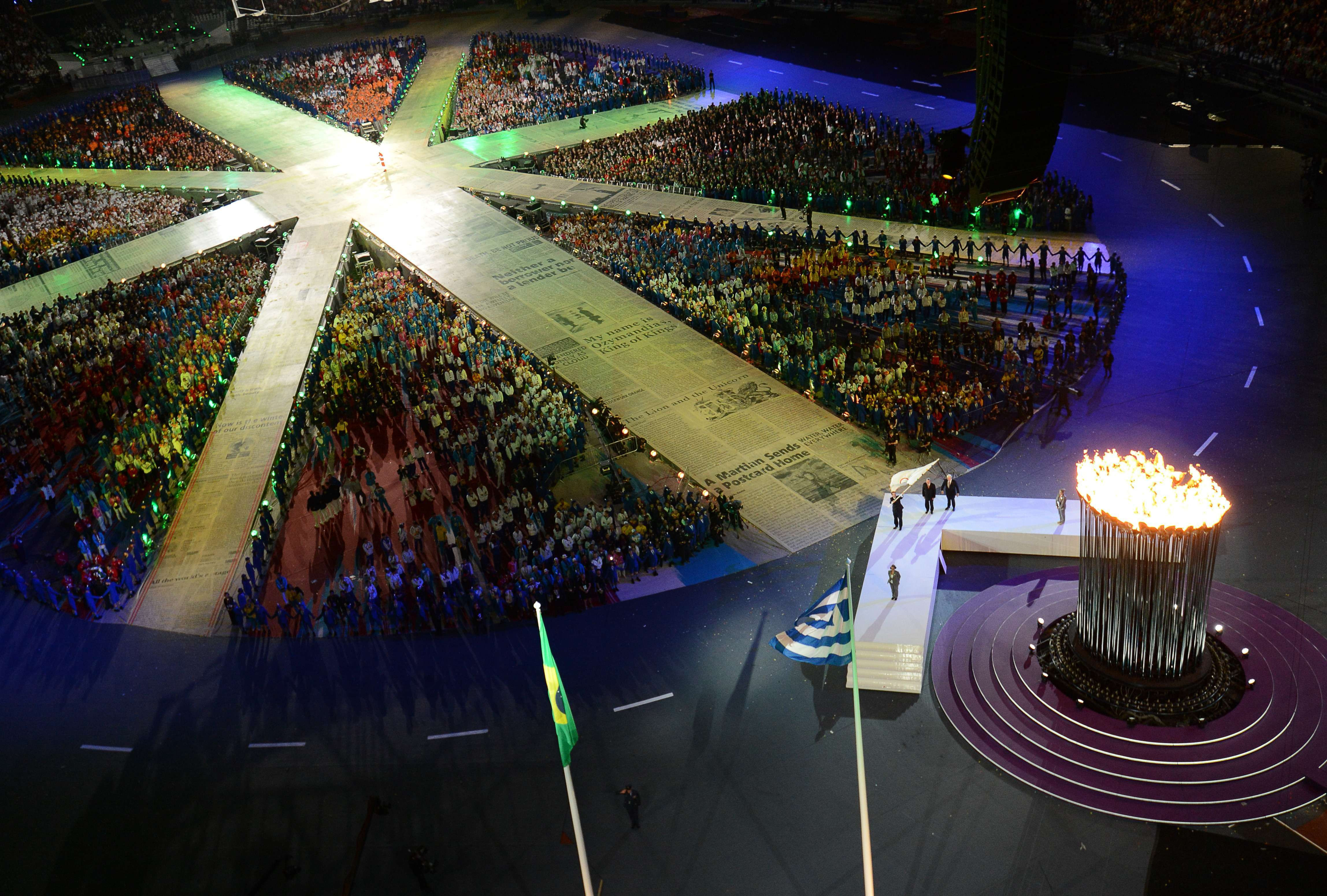 Flacara olimpica s-a deschis in 204 "petale", deasupra aparand o pasare de foc, moment insotit de o noua surpriza: trupa Take That cantand "Rule the world". Deasupra stadionului s-au aprins focuri de artificii, iar peste 200 de balerine de la Baletul Regal s-au indreptat in pasi de dans catre petale, care s-au stins.