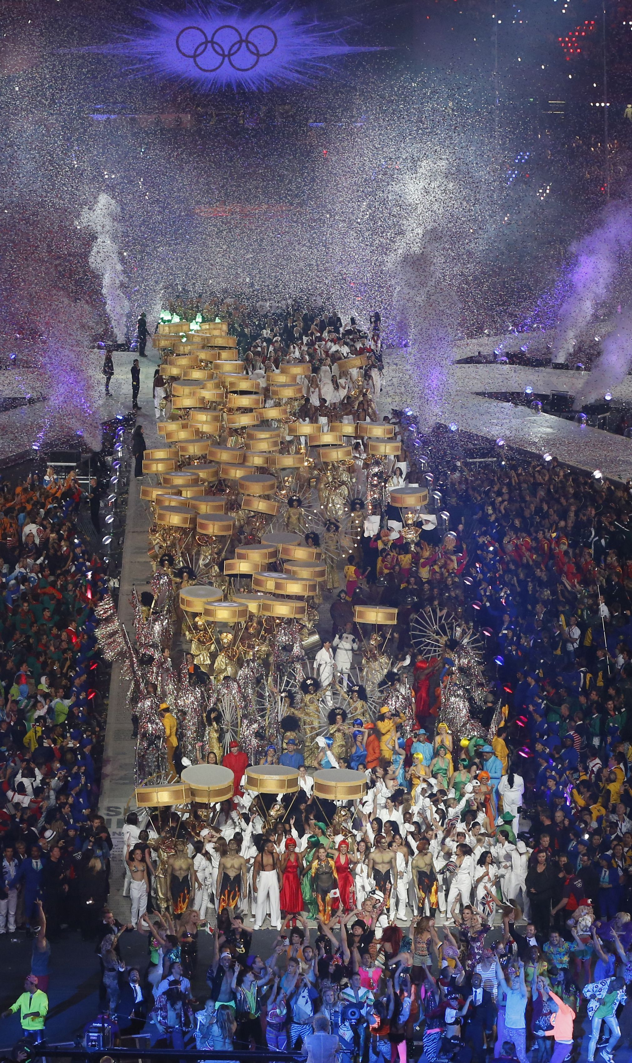In fata drapelelor celor 204 natiuni, ugandezul Stephen Kiprotich a primit medalia de aur pentru succesul din proba masculina de maraton, iar kenyenii Abel Kirui si Wilson Kipsang Kiprotich au primit medaliile de argint si de bronz. Kiprotich si-a ascultat emotionat imnul national, dupa care in scena au intrat sportivii alesi in acest week-end in CIO, dar si reprezentanti ai celor 70.000 de voluntari care au contribuit la JO, carora organizatorii le-au multumit.