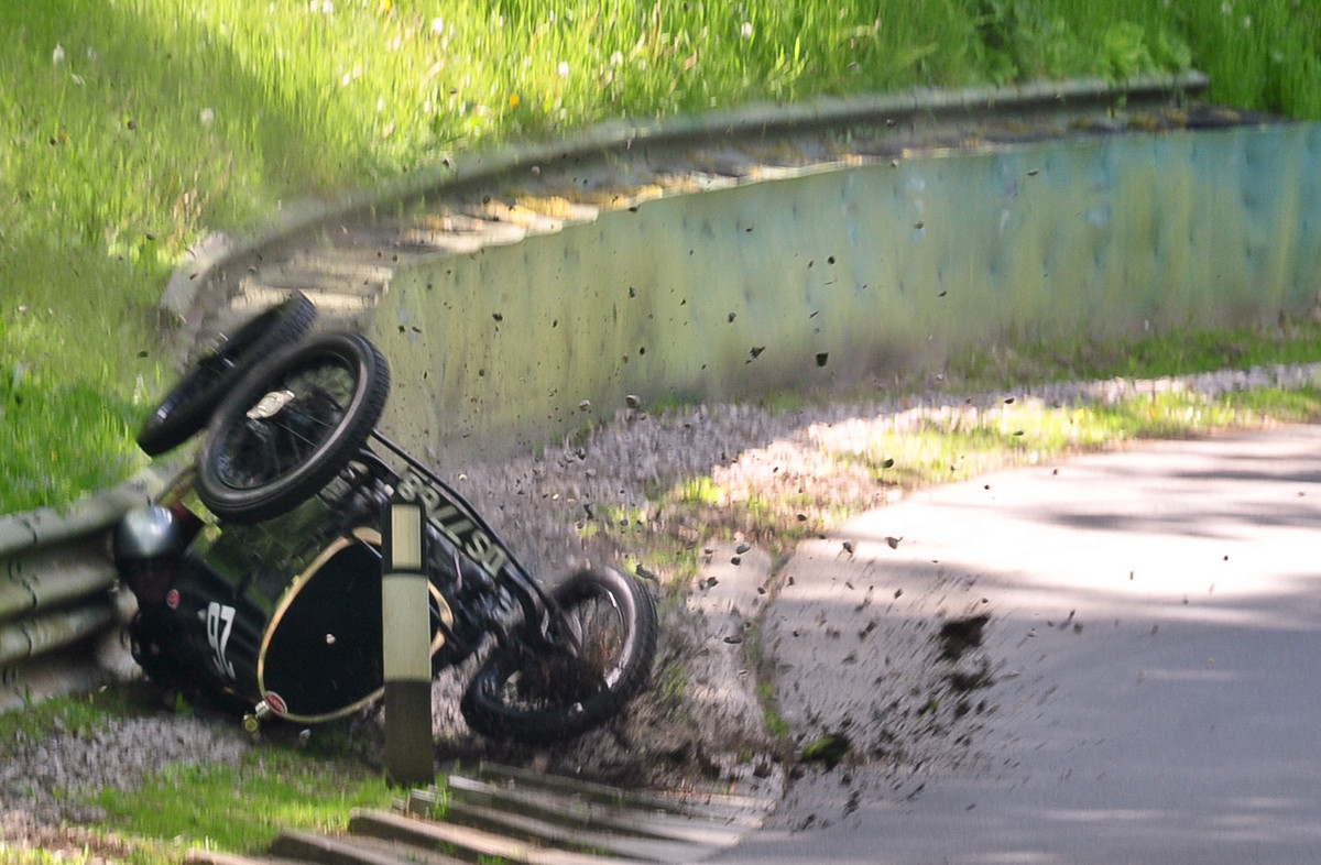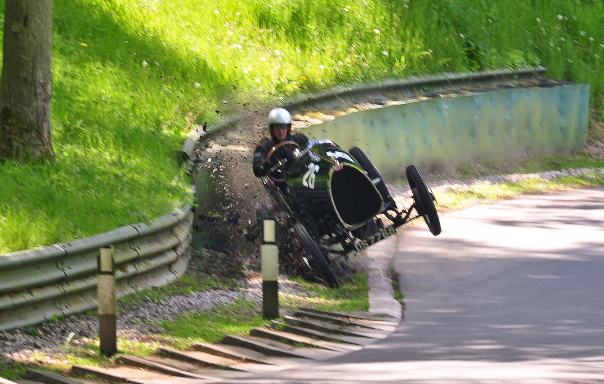 Edmund Burgess concura in raliul de masini clasice de la Winchcombe, cu un Bugatti T13 de 300.000 de euro. A ramas fara frane, intr-un viraj si masina s-a rasturnat spectaculos. Britanicul n-a mai avut ce face si doar s-a tinut bine.