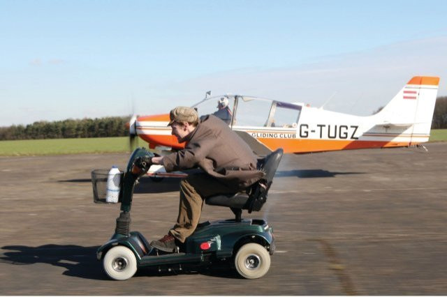 Englezul maniac s-a mai pregatit si pentru pensie. Si-a construit si cel mai tare carucior electric pentru batrani. Special pentru serile de bingo intre pensionari. Daca si-ar fi pus mintea, probabil ca depasea lejer orice Dacie din anii ’80. Dar n-a incercat sa se ia la intrecere cu o Dacie ci cu un..avion! De fapt, masinaria s-a dovedit atat de rapida incat a doborat recordul mondial de viteza la categoria sa – a atins 112 km/h.