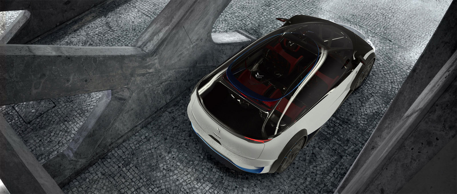 Tot ansambul poarta amprenta reducerii de greutate. Sasiul modular e construit din fibra de carbon si aluminiu. Caroseria, facuta din aceleasi materiale, este fluida dar respecta liniile Citroen. In plus, plafonul panoramic si geamurile masinii sunt realizate din policarbonat fotosenzitiv. Designerul a integrat perfect functionalitatea diverselor elemente. Astfel, podeaua masinii joaca rol de difuzor, in timp ce evacuarea e integrata in spoilerul spate pentru a reduce rezistenta la inaintare. Interesant arata si blocurile optice LED (in fata) si OLED (in spate).