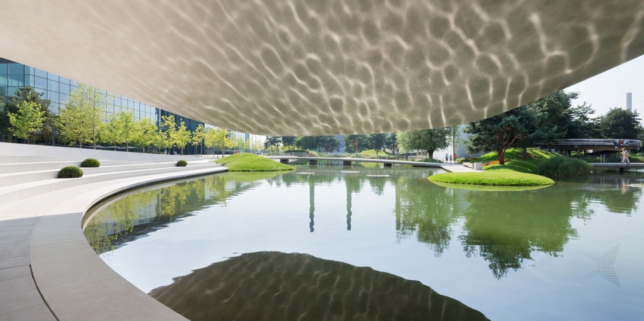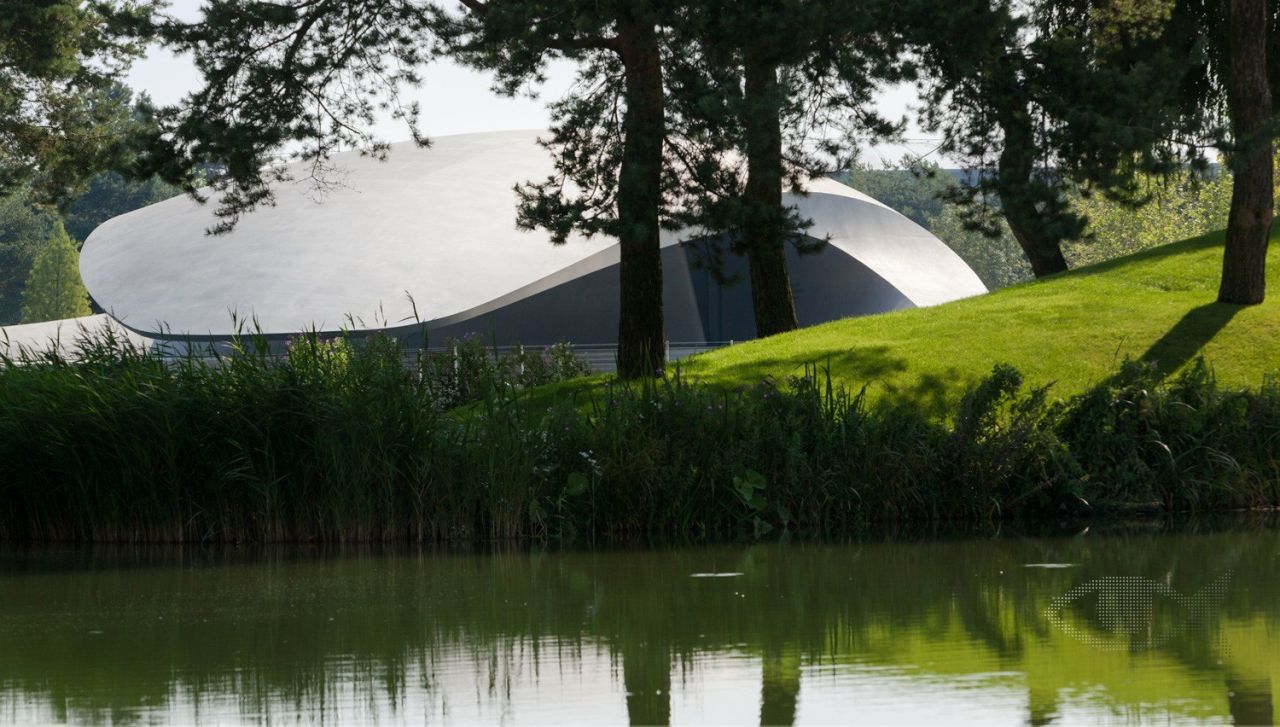 Cea mai spectaculoasa portiune a pavilionului e consola de 25 de metri, care se extinde deasupra apei. Spatiul pe care il creaza e perfect integrat in peisaj, dar are si rolul de incinta acustica, pentru cateva sute de vizitatori.