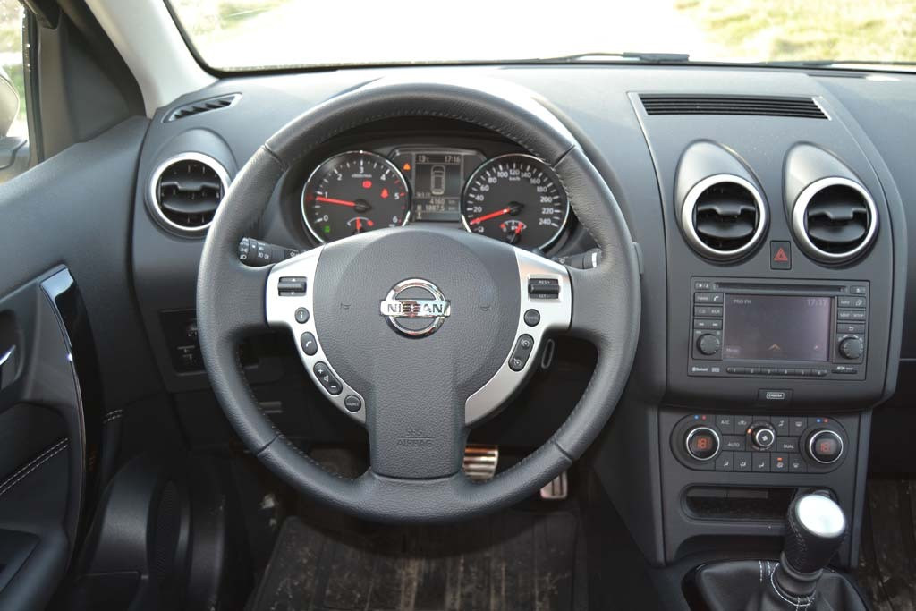 Comenzile sunt ergonomice si dispuse aerisit, exceptie facand butoanele pentru climatizare. Ne-a placut mult si dispunerea comenzilor de pe volan, intuitiva si usor de folosit, fara a fi nevoit sa iei mainile de pe el. Sistemul Nissan Connect si ecranul de 5” iti arata cam tot ce trebuie sa stii, dar punem un mare minus in fata sistemului de navigatie, care a ramas pur si simplu in urma. Hartile sunt incomplete pentru orasele mici, iar modul in care calculeaza rutele ramane o mare problema.Dar problema e foarte usor de rezolvat, pentru ca hartile sunt pe card SD.Totusi, Nissan Connect iti ofera toate functiile de conectivitate pentru orice masina care se respecta in ziua de astazi. Dimensiunile unui Qashqai +2 il apropie totusi de un SUV, iar parcarea se face greoi. Insa aici ni s-a parut cel mai util sistemul de camere pentru parcare Around View 360. Vederea e panoramica, iar liniile de ghidare ajuta mult, cu o conditie: lentilele camerelor sa nu fie prea murdare.