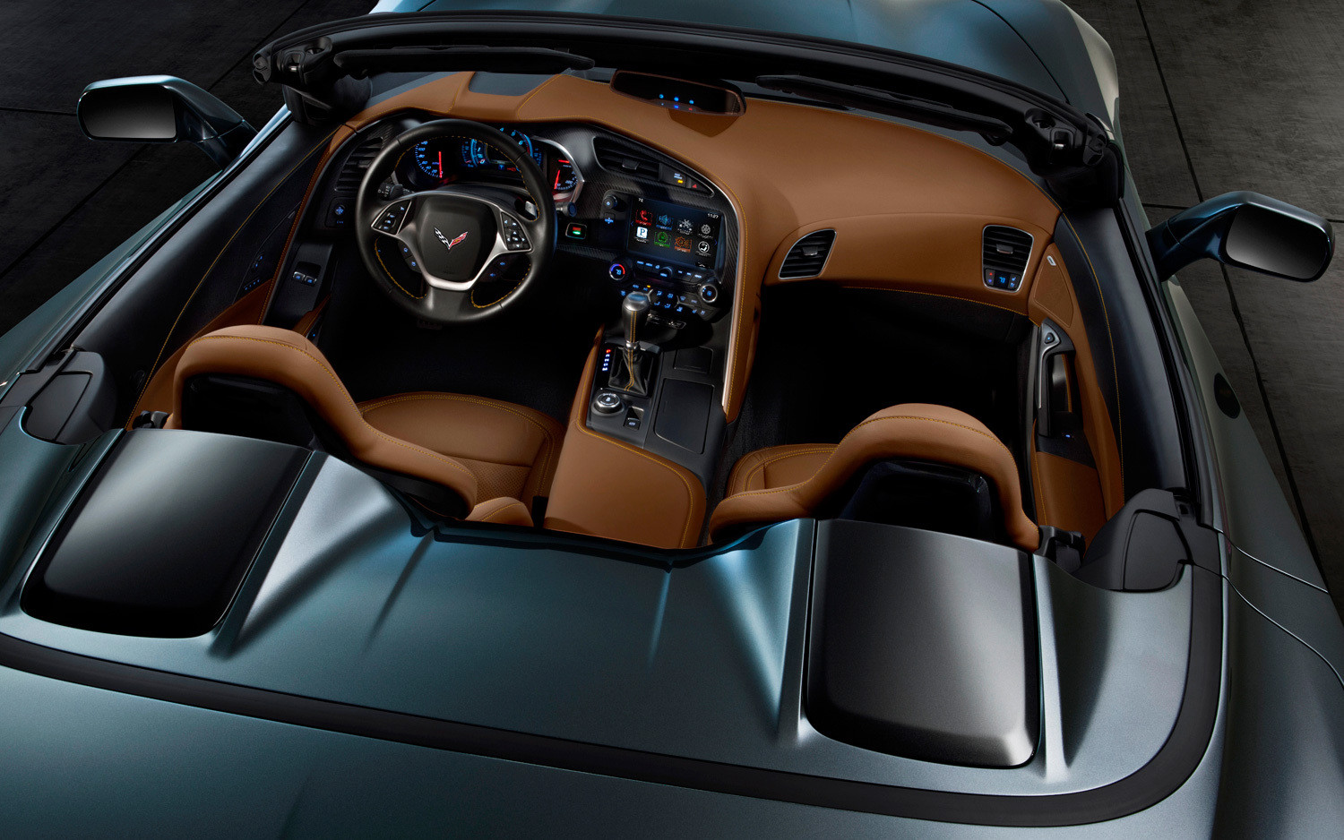 In afara soft top-ului textil, americanii au eliminat prizele de ventilatie pentru transmisie si diferential cu un sistem de prize si difuzoare de aer amplasate sub masina. La interior, Stingray Convertible se bucura de aceleasi materiale premium prezente si pe coupe: fibra de carbon si ornamente din aluminiu, piele nappa si microfibra pentru scaunele GT standard sau configuratia de locuri Competition, pentru circuit. Aceleasi LCD-uri de 8” (unul pentru sofer si celalalt amplasat central), precum si head-up display-ul de pe coupe sunt prezente si in varianta cabriolet, impreuna cu sistemul Drive Mode Selector.