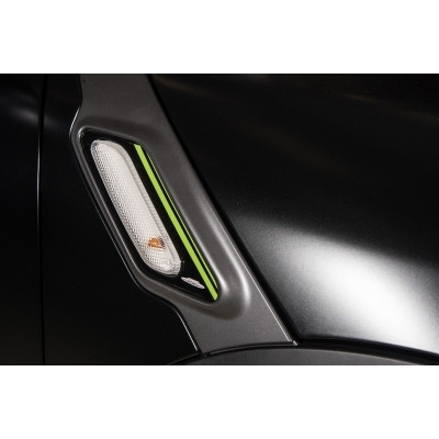 Interiorul e putin mai subtil. Contrastul negru-verde iti sare si si aici in ochi. Burduful schimbatorului de viteze si covorasele sunt cusute cu verde. Cu aceeasi culoare e brodat logo-ul castigatorului pe scaune si tetiere. Numarul de serie apare desupra compartimentului pentru manusi.