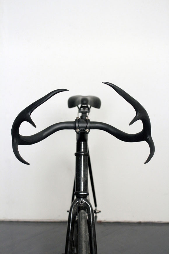 Americanul a gasit o pereche de coarne de cerb la un targ de vechituri in 2010. I-au mai trebuit apoi putina rasina epoxidica, vopsea negru satin si o teava metalica reciclata. Rezultatul e nebunie curata, dar nu garantam ca ar fi si sigur. Sau, ca s-ar gasi vreun ciclist indeajuns de curajos incat sa il incerce.