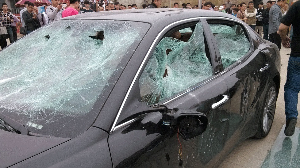 Chinezul a innebunit de nervi dupa ce dealerul i-a reparat masina si a folosit piese de schimb la mana a doua. Mai mult, l-a taxat ca pentru o piesa noua. Si-a sunat patru prieteni, s-au inarmat cu baroase si au facut praf masina in fata spectatorilor stupefiati.