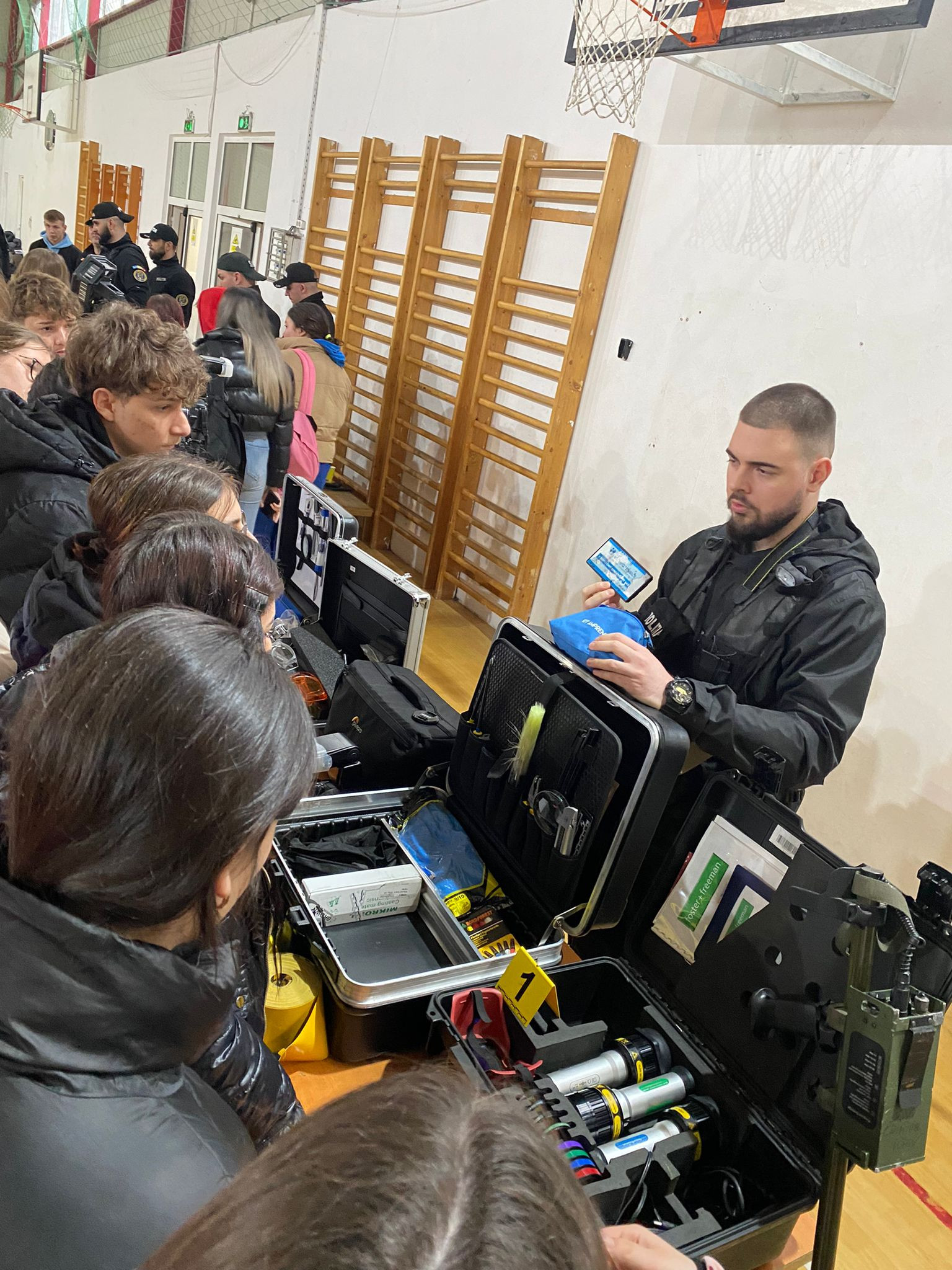Serviciul criminalistic și-a prezentat activitatea, arătând și practic, spre fascinația copiilor, trusa criminalistică de cercetare la fața locului, detectorul de metale, trusa Crime Light cu trei surse de lumină pentru identificarea urmelor papilare și alte probe biologice. Elevii au avut ocazia să preleveze amprente, folosindu-se de pulberea neagră magnetică.