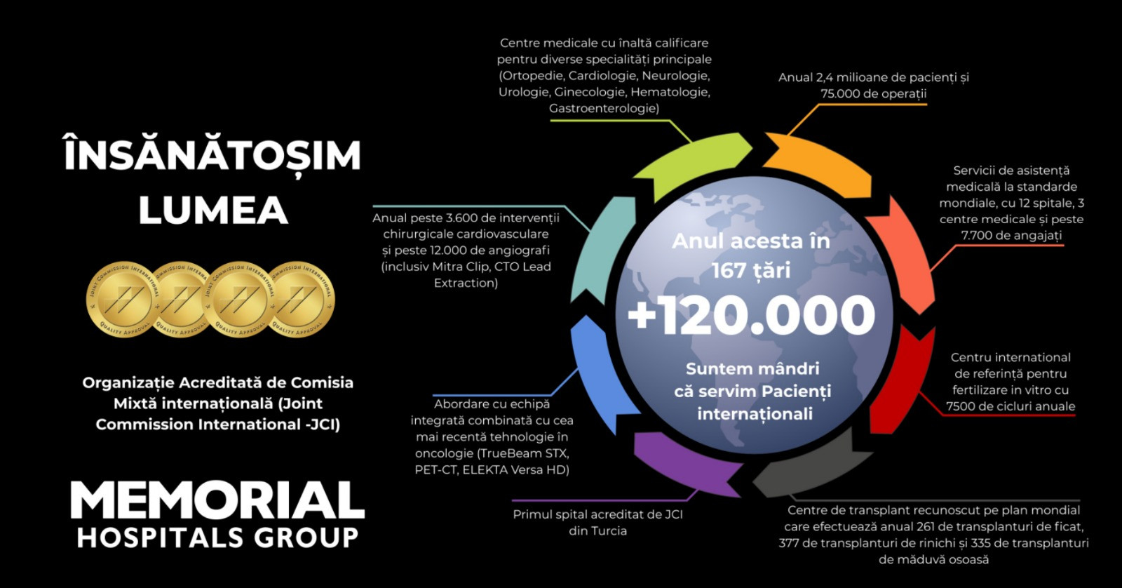 Memorial Hospital Group a fost primul spital din Turcia care a obținut acreditarea JCI (Joint Commission International), considerată etalonul de aur în domeniul asistenței medicale. Cu o rețea de 11 spitale (10 în Turcia și unul în România) tehnologizate și orientate spre nevoile pacienților, alături de 2 centre medicale și 1 centru de wellness, Memorial Hospitals Group operează în 5 orașe din Turcia, oferind anual servicii de sănătate pentru 120.000 de pacienți internaționali proveniți din peste 167 de țări. Performanțe notabile în cardiologie: anual, echipa Memorial realizează 3.600 de intervenții chirurgicale cardiovasculare și 12.000 de angiografii, incluzând proceduri avansate precum TAVI, Mitra Clip și extracția CTO Lead. În centrele de transplant renumite la nivel global, specialiștii Memorial realizează anual 261 de transplanturi de ficat, 377 de rinichi și 335 de măduvă osoasă. Ratele de succes în transplanturile de rinichi și ficat sunt de 99%, respectiv 93,5%. La nivel de grup, vorbim despre volume anuale impresionante: 2,4 milioane de pacienți tratați și 75.000 de intervenții chirurgicale efectuate. Memorial Hospitals Group adoptă noile tehnologii cu rapiditate, pentru a dubla pregătirea extraordinară a personalului medical, ghidat de principii etice solide și respectând standardele internaționale de calitate.