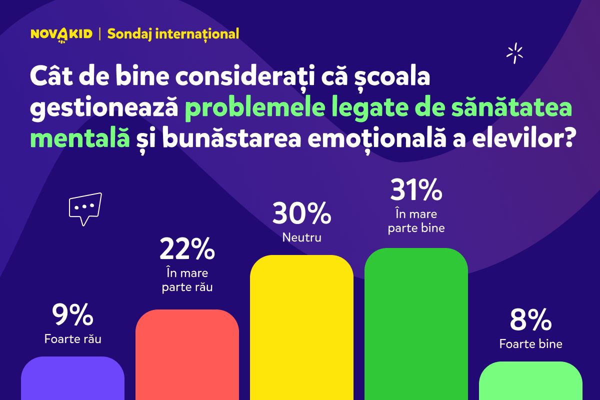 Întrebați ce părere au despre maniera în care este sprijinită bunăstarea psihică a elevilor, respondenții din România (39%) și Italia (37%) au privit cu optimism situația, menționând că este tratată bine. La polul opus, cei din Polonia (36%) au fost destul de nemulțumiți de acest aspect.