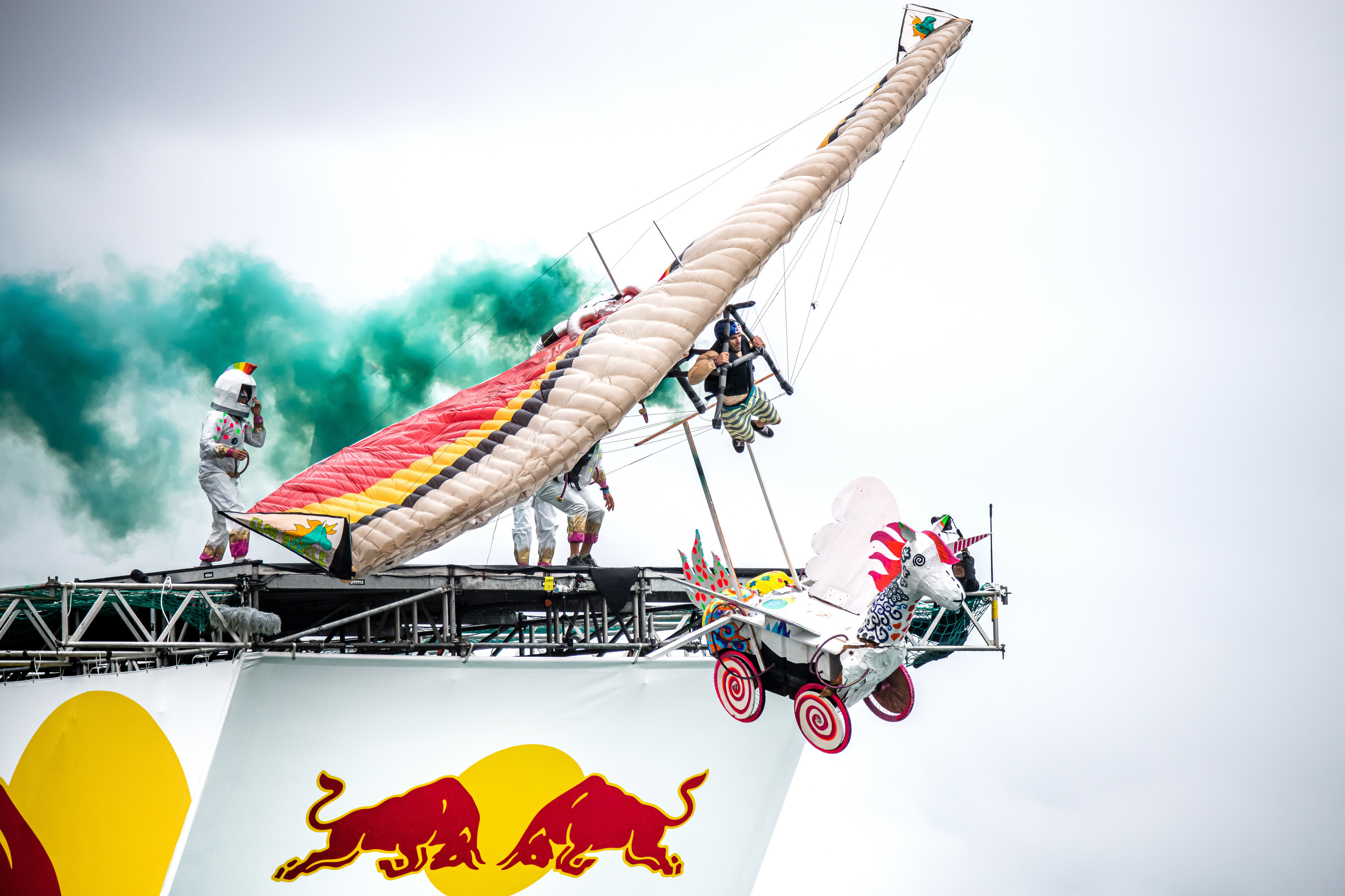 • designul rămâne la latitudinea fiecăruia, însă originalitatea este și ea premiată. Istoria Red Bull Flugtag a demonstrat că orice aparat, oricât de năstrușnic, poate zbura. De la porci, nave spațiale, urși, la albine uriașe sau chiar la vehiculul renumiților Fred și Barney.