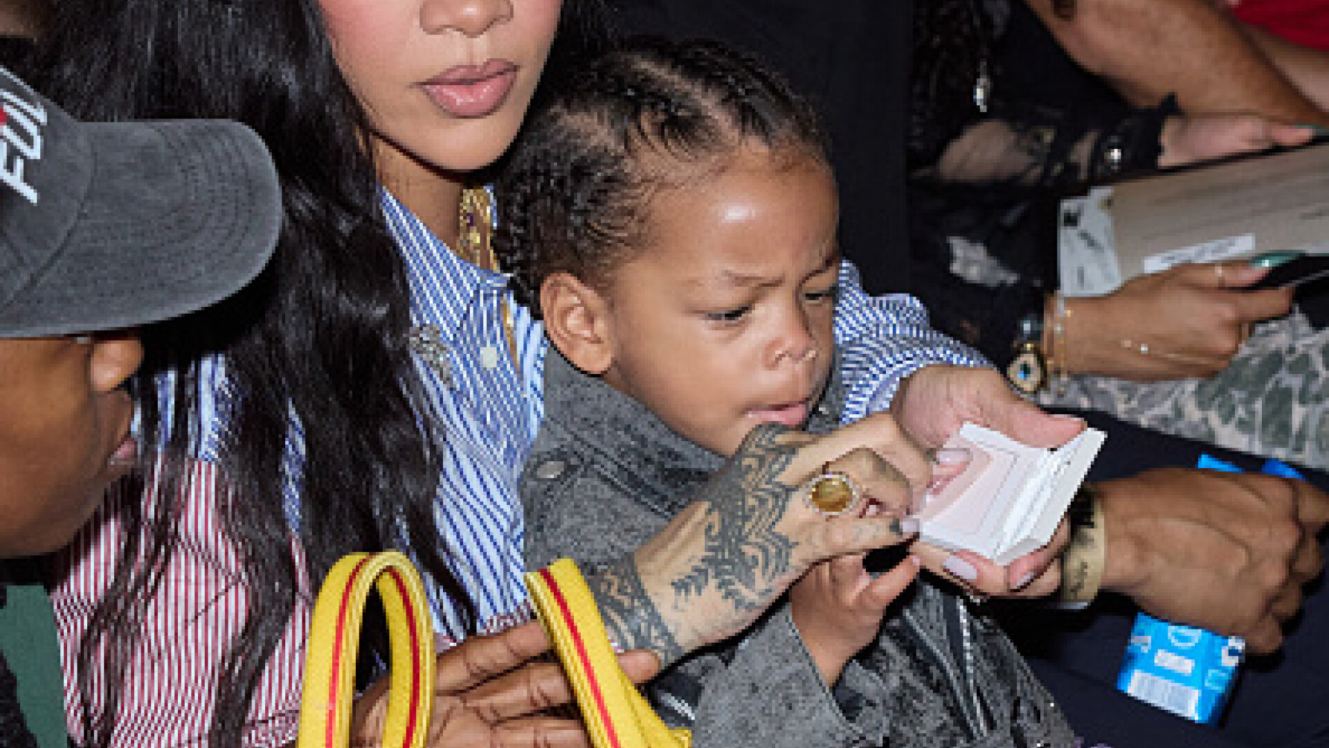 Reporterii au încercat să obțină un răspuns direct și de la Rihanna, care a fost mult mai rezervată: „Să vedem dacă e Smurfette... sau poate Papa Smurf. Cine știe?” Totuși, a confirmat că tradiția continuă și nou-născutul va primi un nume care începe cu „R”.