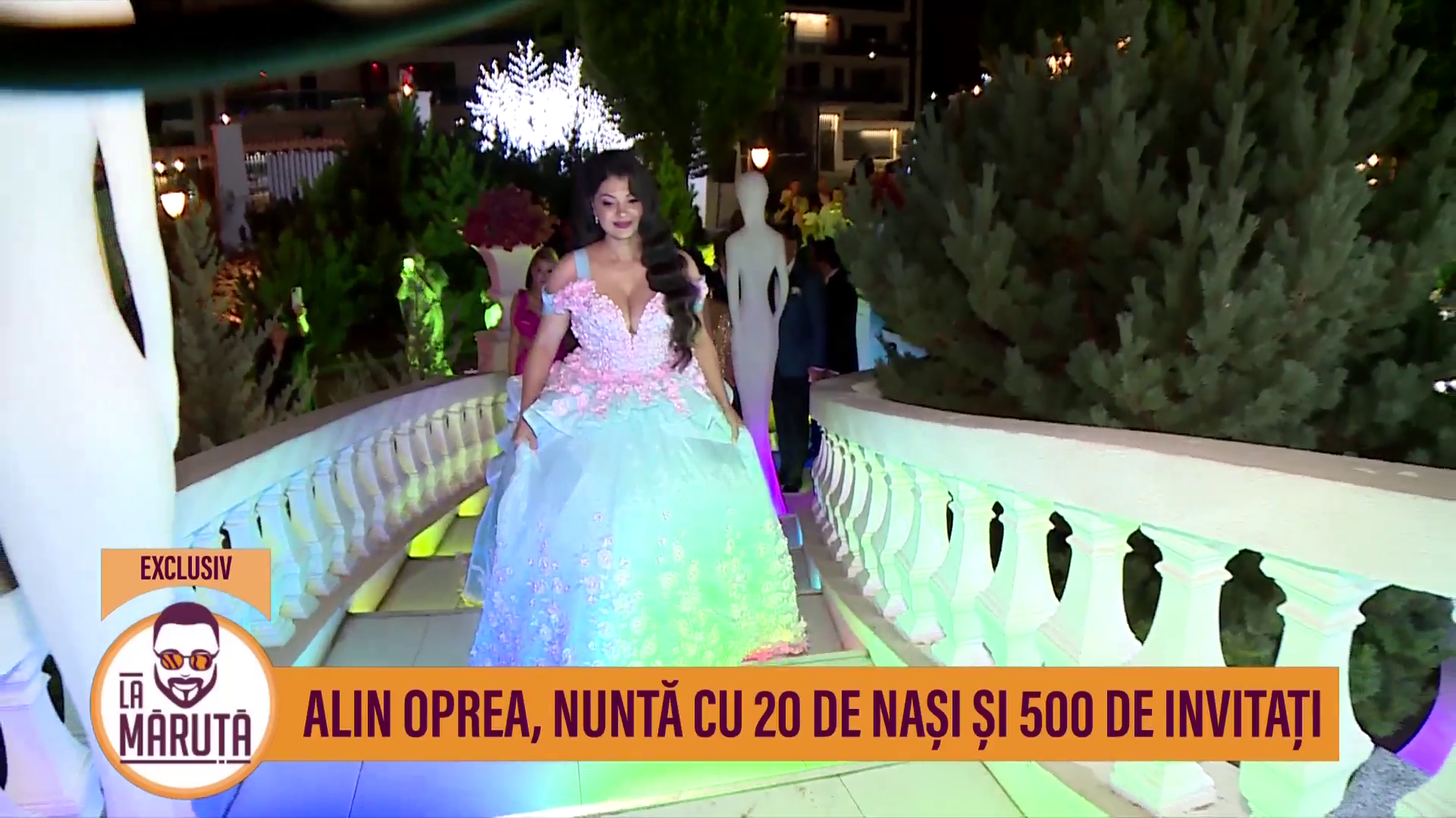 Medana Oprea a purtat două rochii albe de mireasă. Alin Oprea a avut și el două ținute: un costum turcoaz și un frac impecabil.