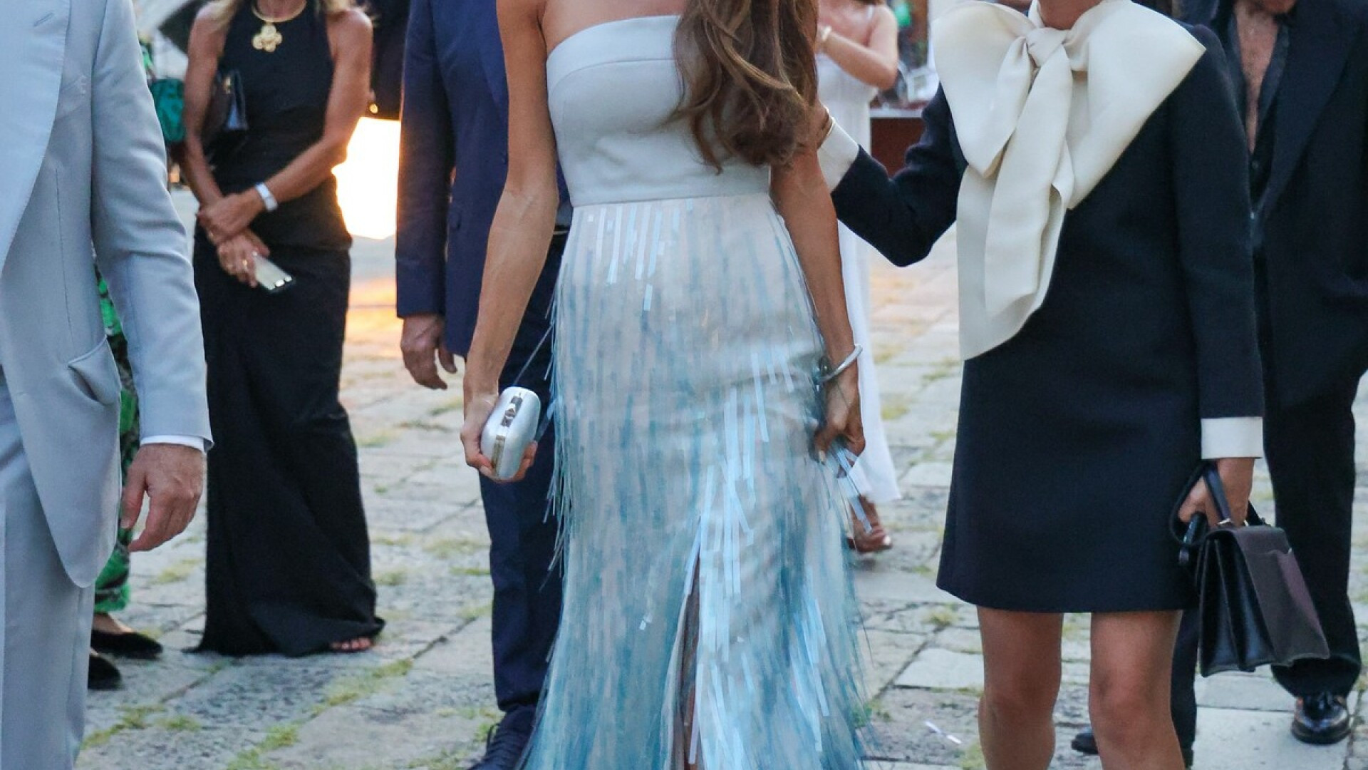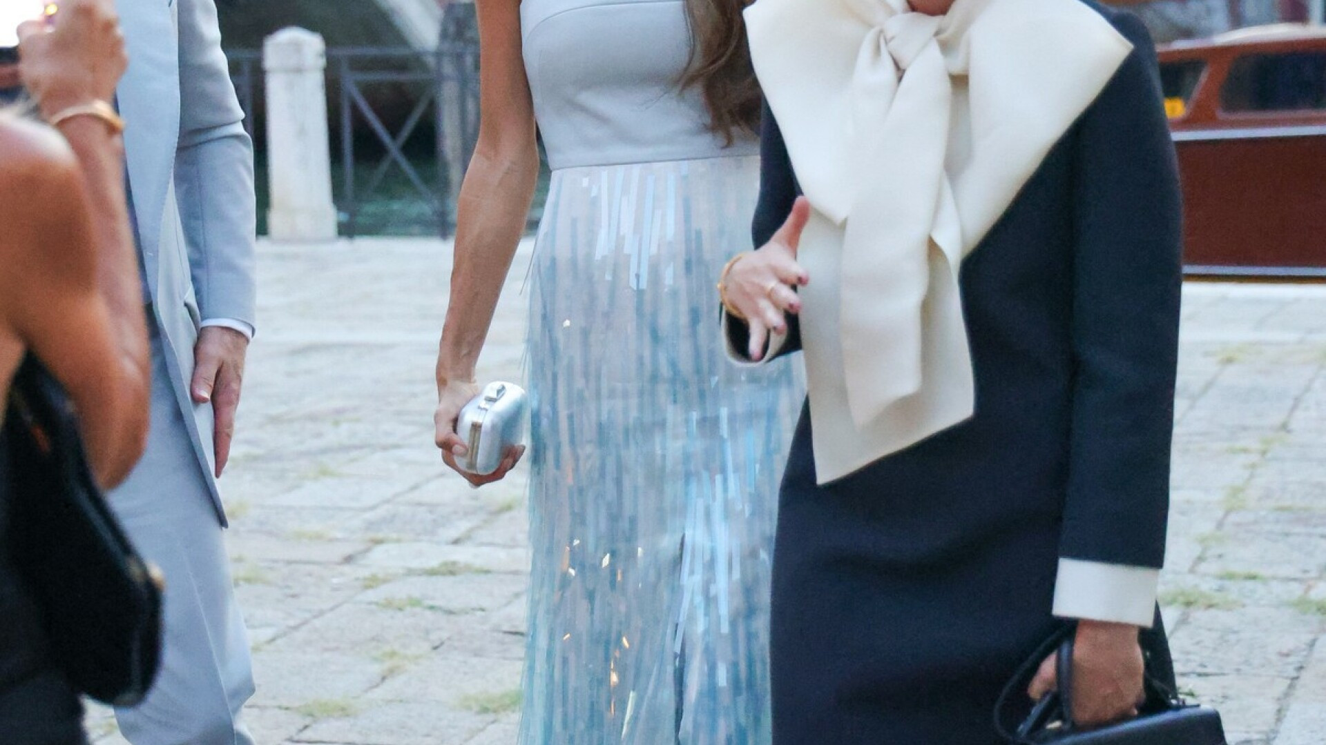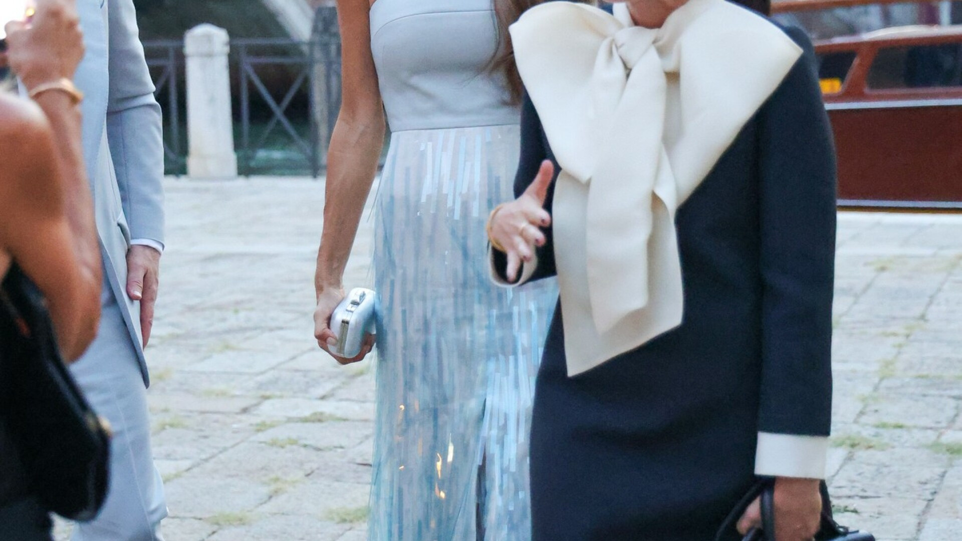Rochia fără bretele, semnată Stella McCartney (1.250 de dolari), era realizată dintr-un material tip plasă, cu decupaje pe laterale. Amal Clooney a accesorizat ținuta de vară cu o geantă de tip clutch, neagră, sandale metalice bronz Gianvito Rossi și cercei lungi, clasici.