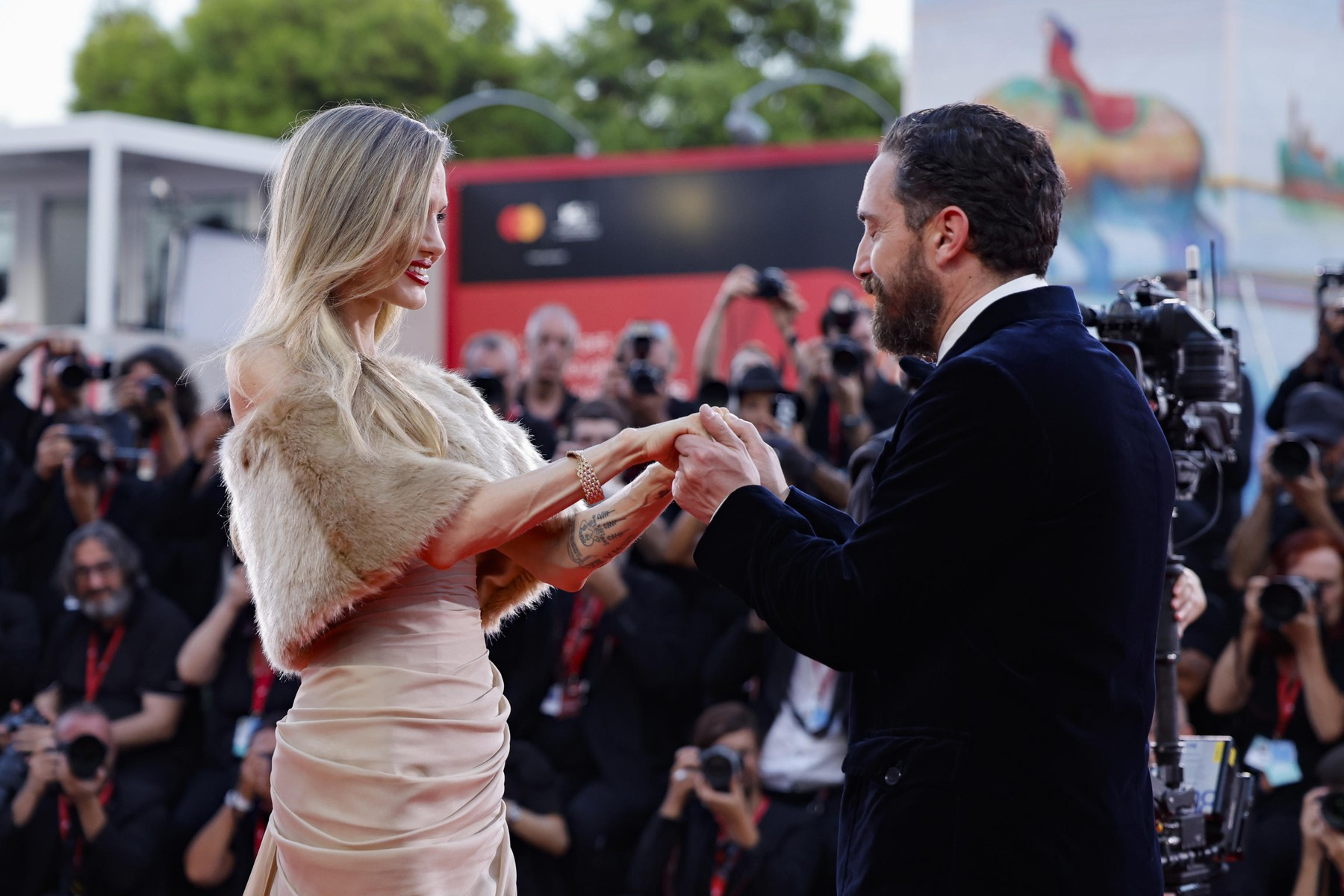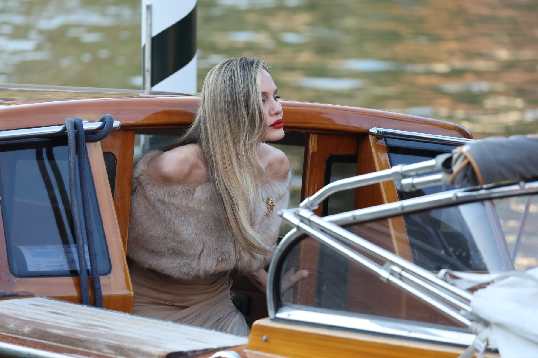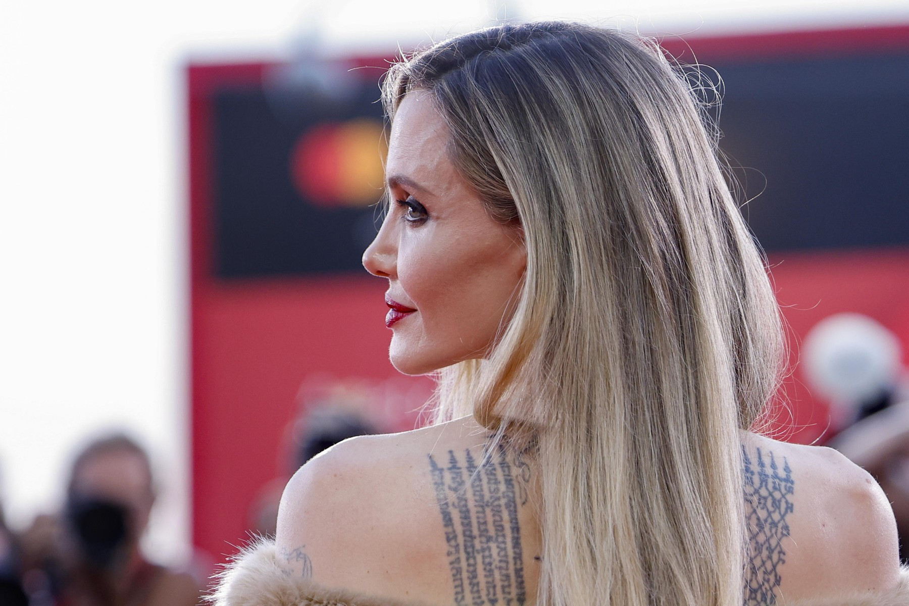 Cu doar câteva ore înainte, vedeta din „Maleficent” fermeca publicul de la Veneția cu o altă rochie, ceva mai îndrăzneață, cu spatele gol, care i-a scos în evidență colecția impresionantă de tatuaje.